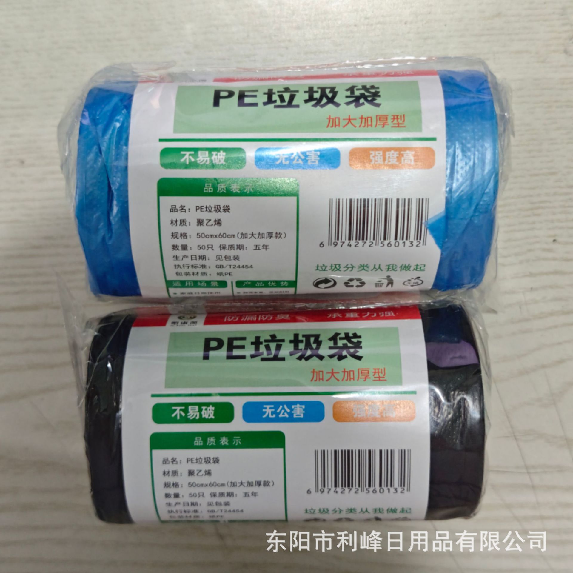 黒いビニール袋の青いサイズを厚くして使い捨て家庭用平口ゴミ袋の現物卸売りをしてゴミ袋を切る