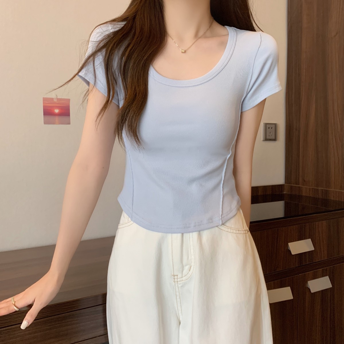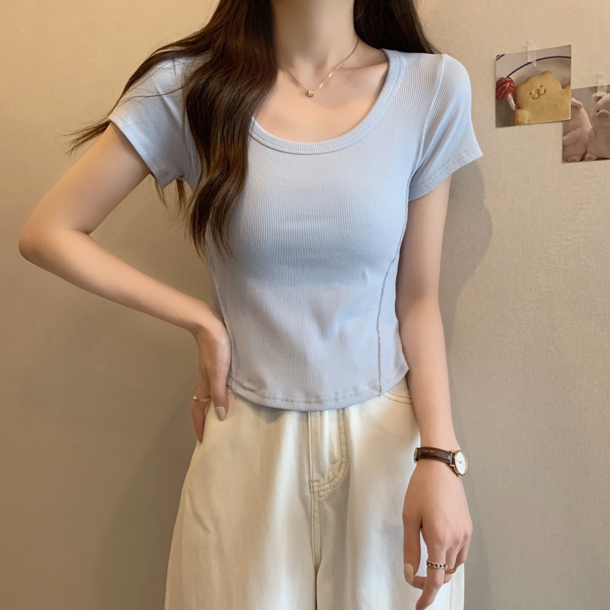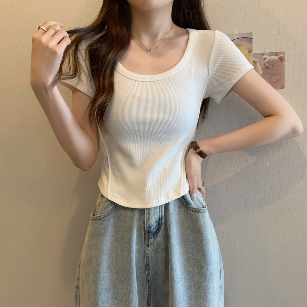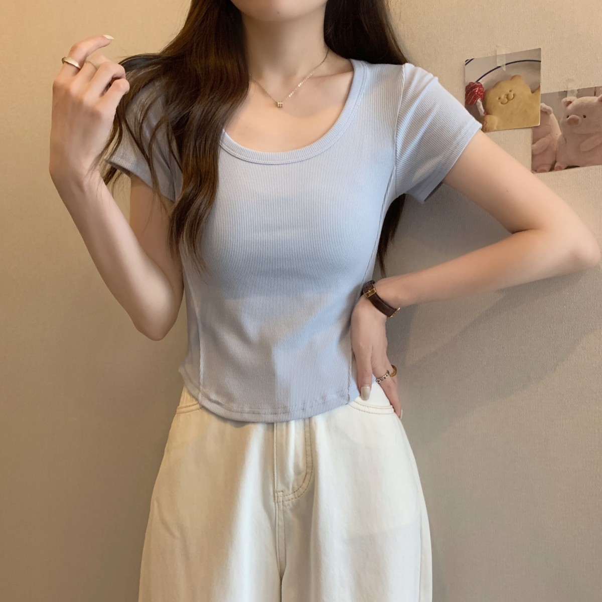 9992#不规则u领短袖t恤女夏季韩版修身高腰短款