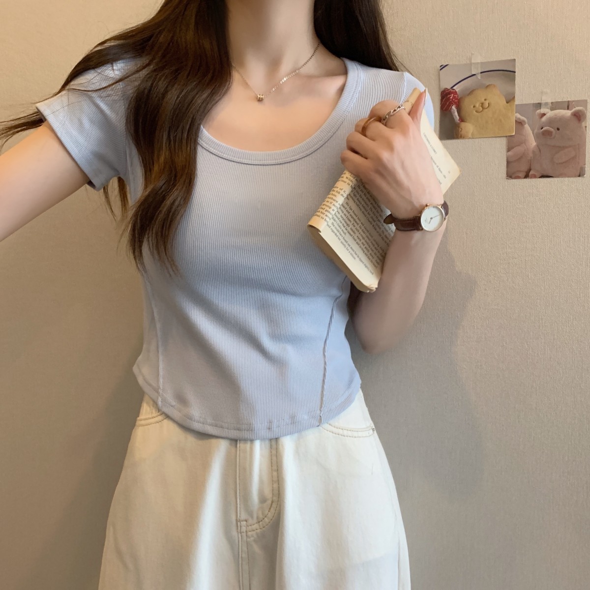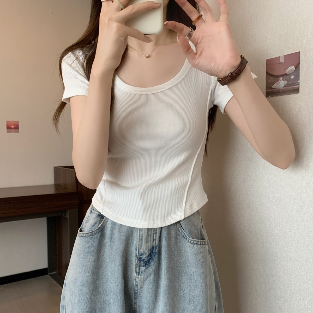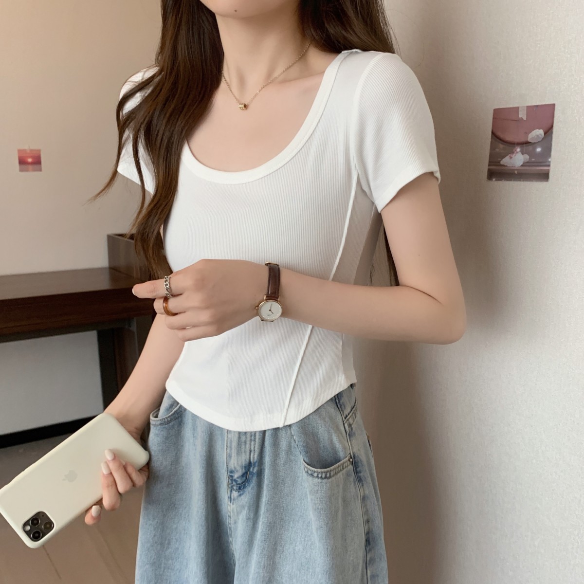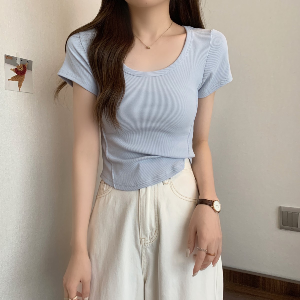9992#不规则u领短袖t恤女夏季韩版修身高腰短款