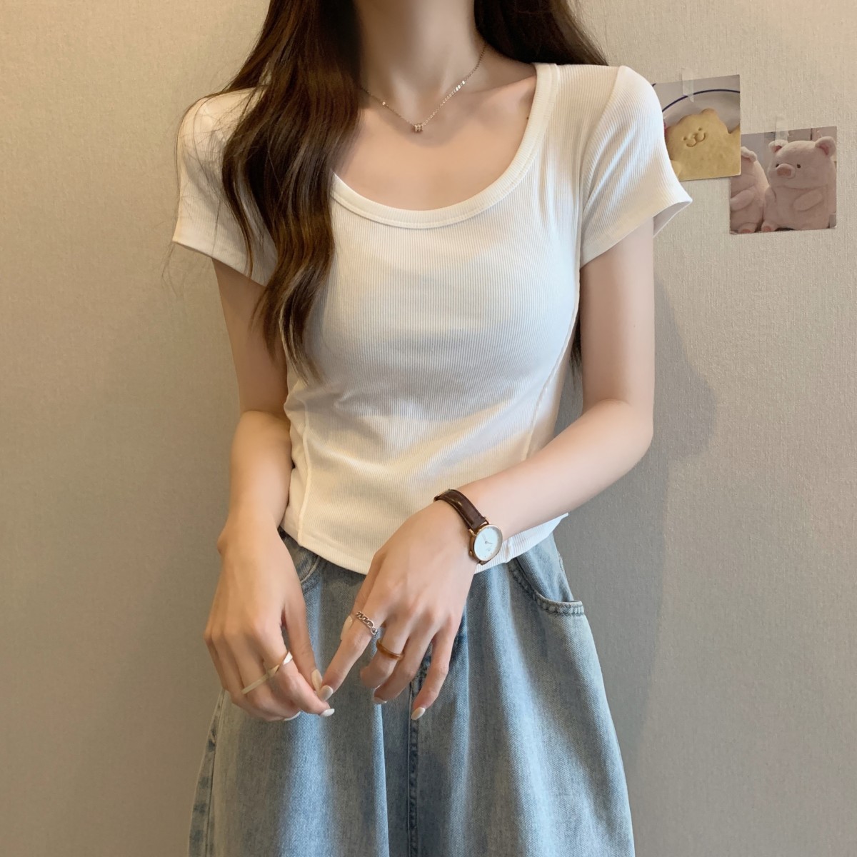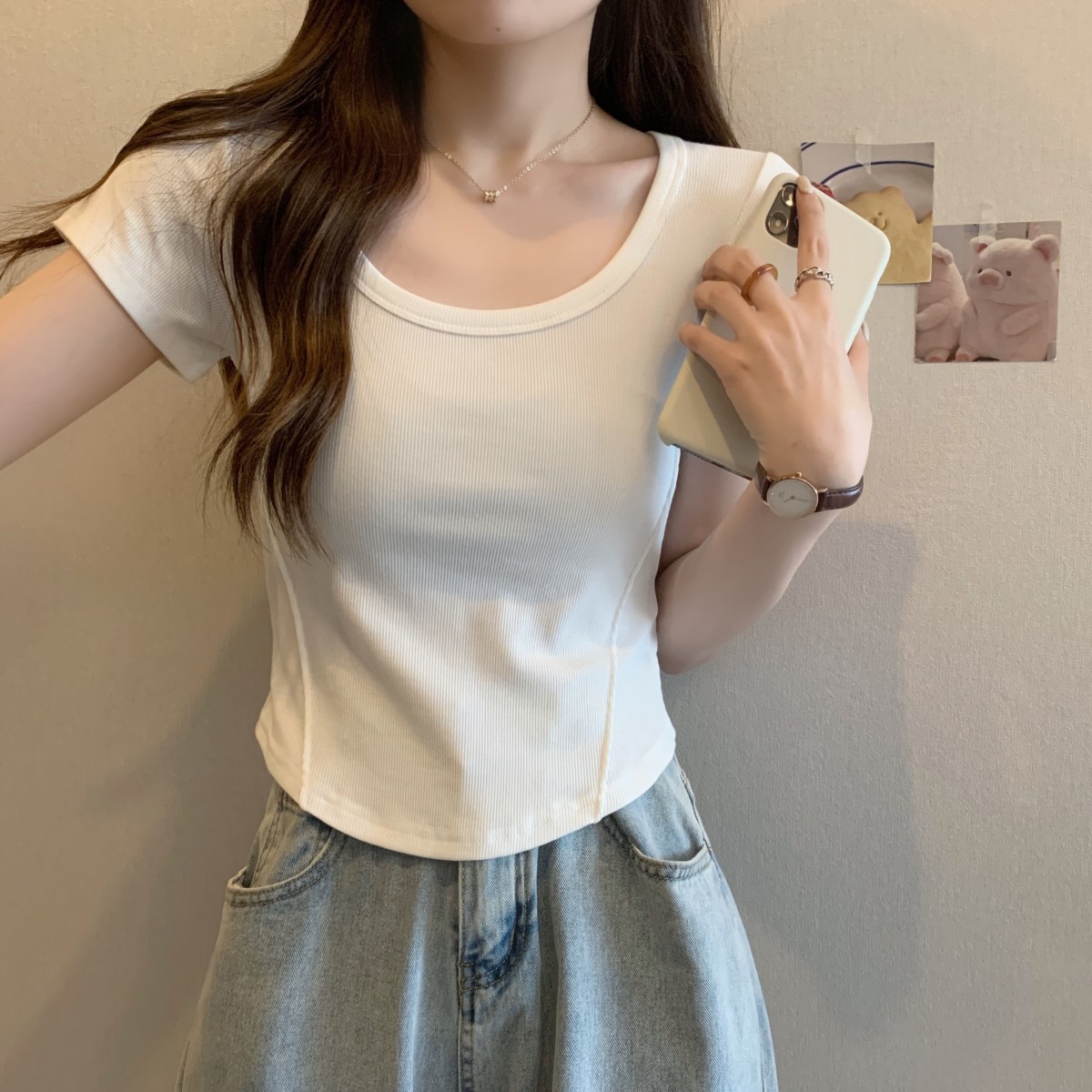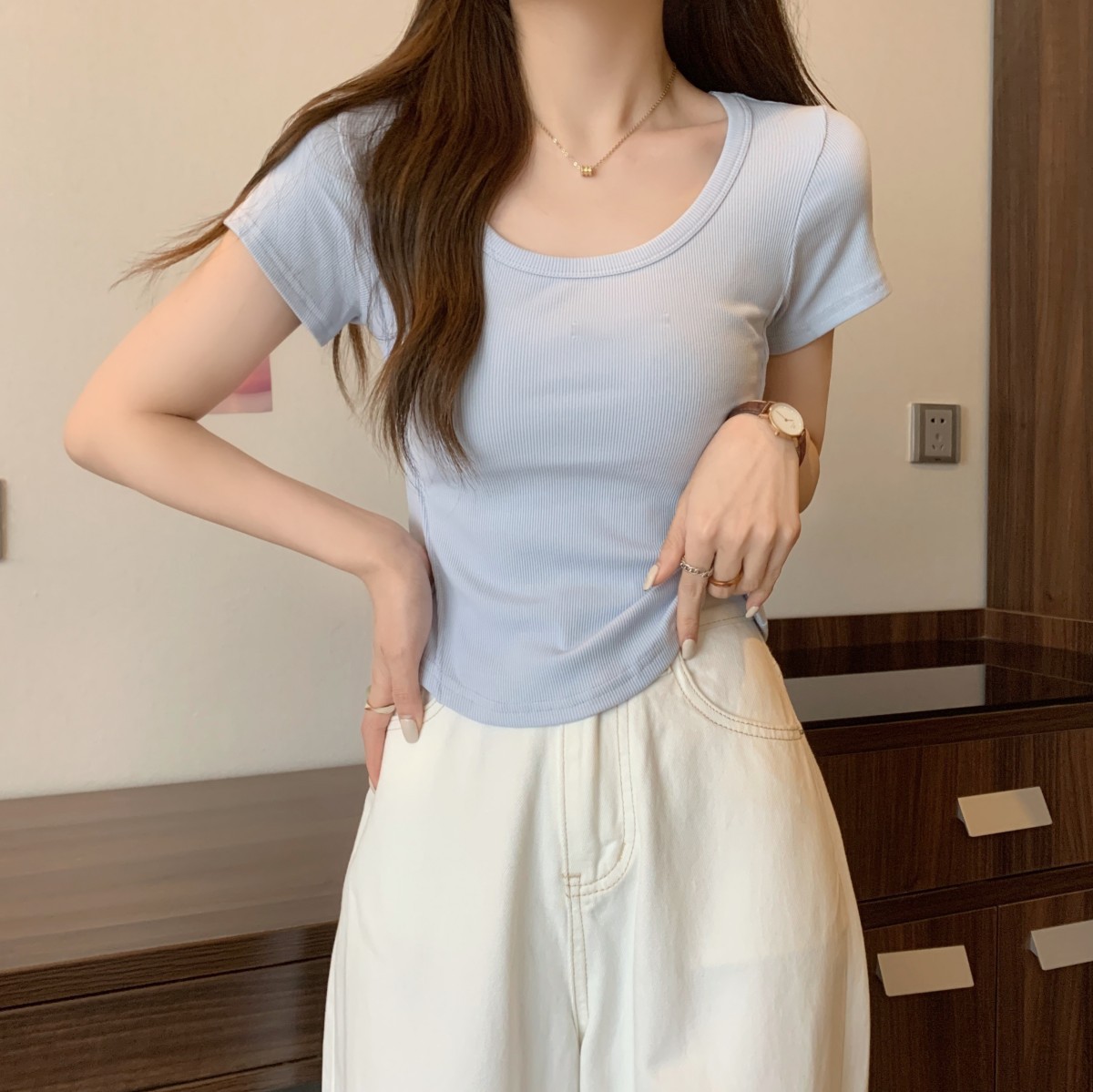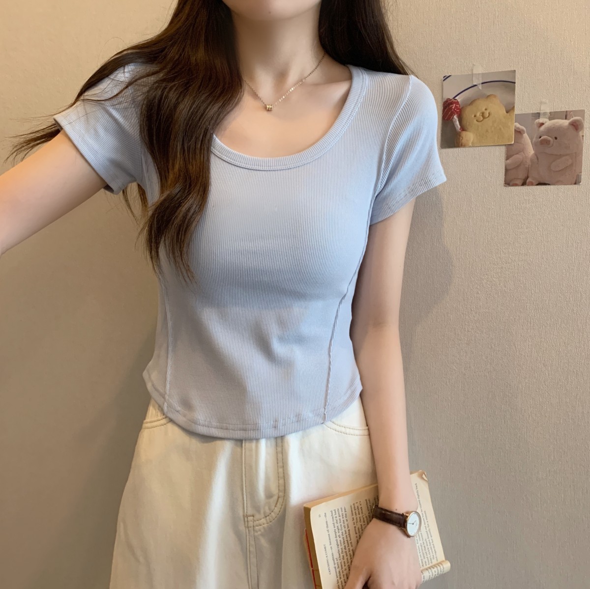 9992#不规则u领短袖t恤女夏季韩版修身高腰短款