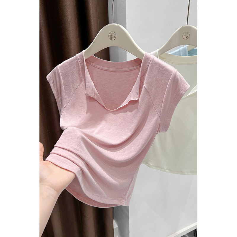 ショートソリッドカラーデザインVネックTシャツレディーススリムソリッドカラーアイスシルク通気性韓国風シンプル小柄ハイウエストトップ