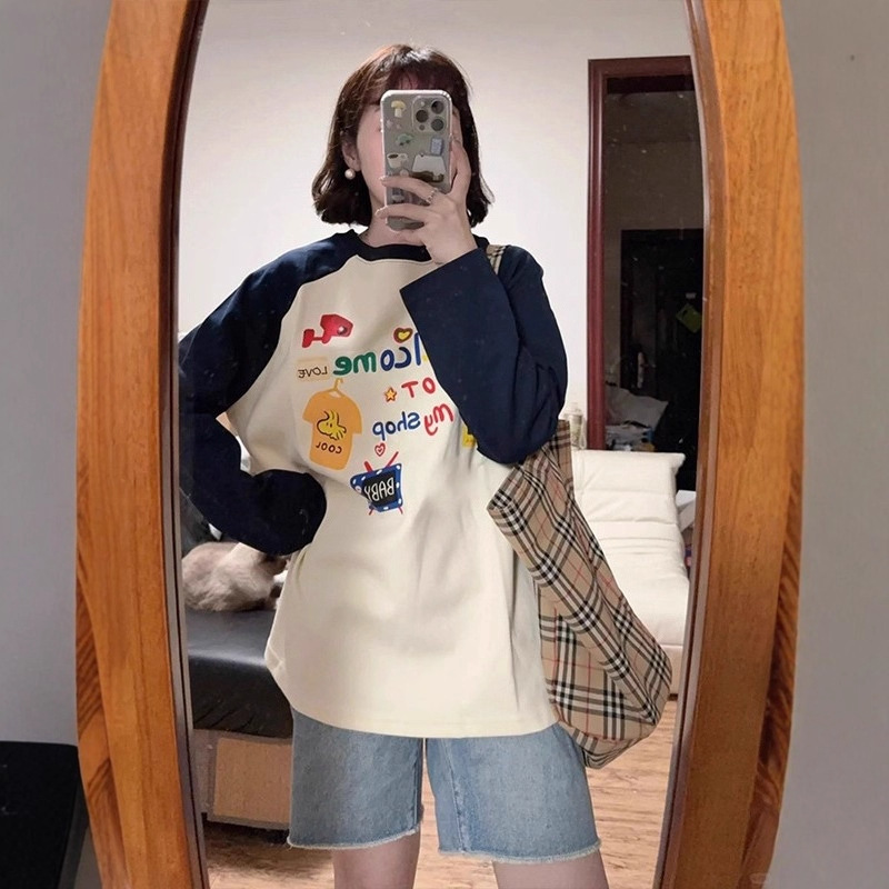 撞色插肩袖宽松长袖T恤女早秋内搭打底美式复古oversize纯棉上衣