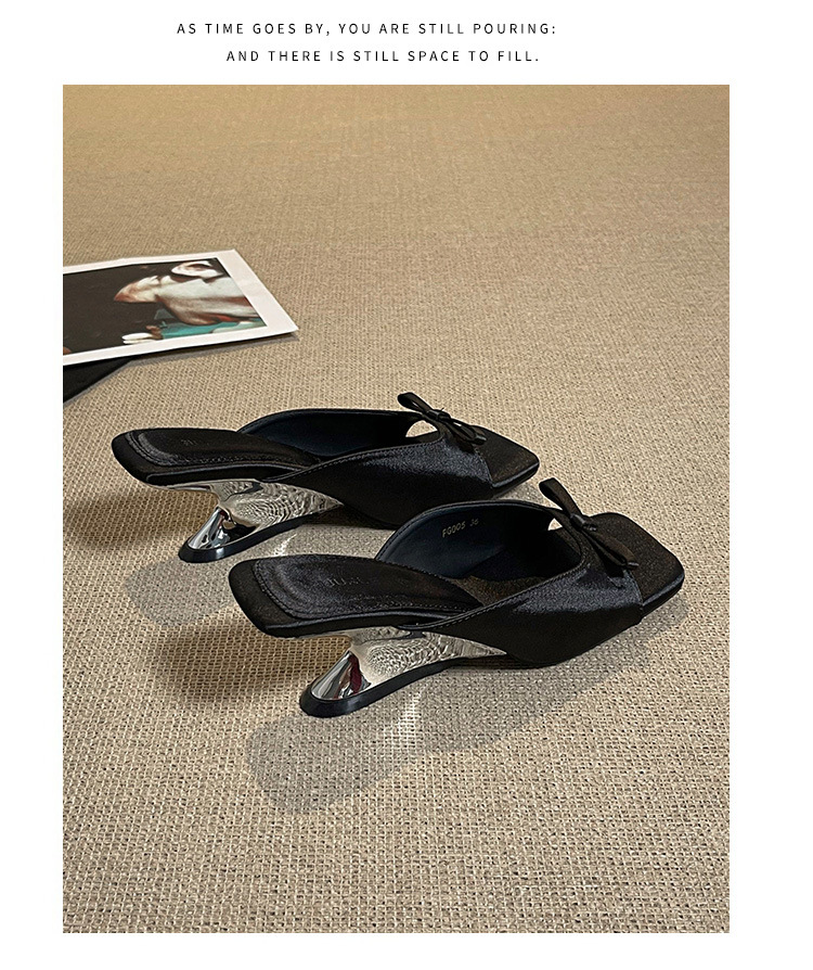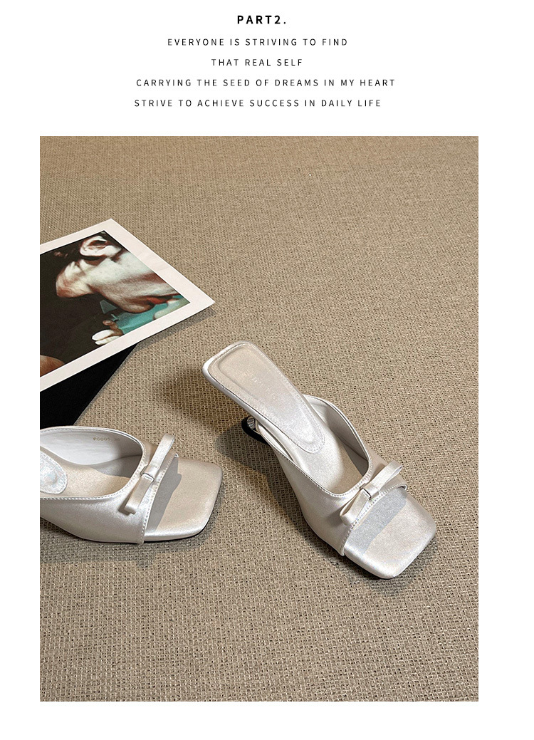 リボンフラットシルバーウェッジスリッパ女子学校スリッパフレンチ2025新スタイルサテンスクエアトゥ夏