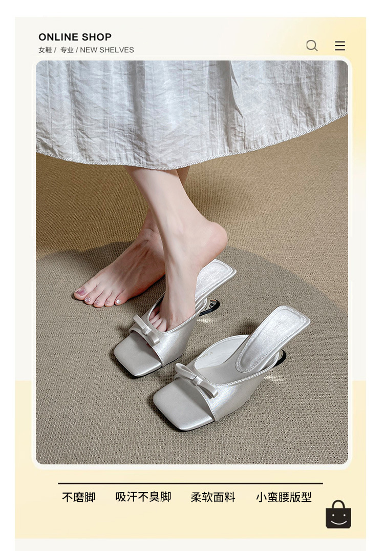 フレンチスクエアトゥボウサンダル女性のハイヒール2025新しい夏サテンの妖精アウターウェアウェッジヒールスリッパ