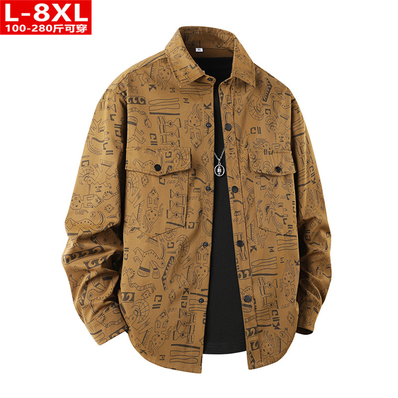 春秋季潮流港风男装帅气印花方领衬衫胖男士加肥大码宽松休闲衬衣