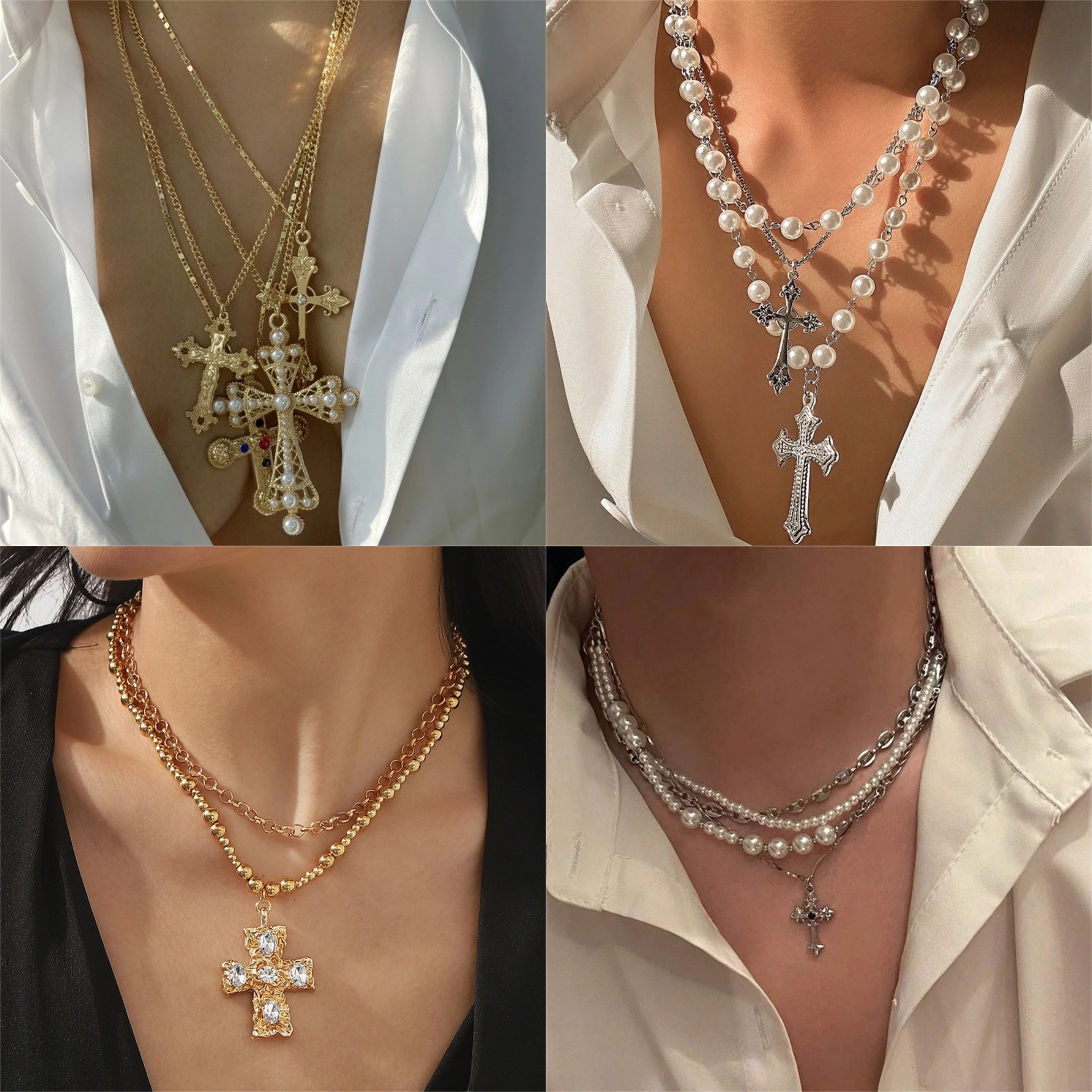 欧美跨境十字架分层珍珠项链串珠吊坠锁骨链女生通勤百搭聚会礼物