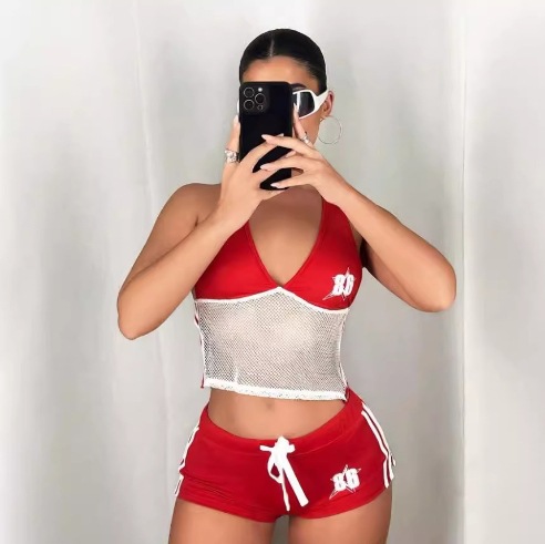 欧米のクロスボーダー2024春の婦人服の新型の首を掛けて背を露出してプリントして身を修めるベストの低い腰をつけて尻のショートパンツのスーツを持ちます。