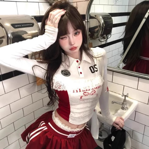 2025バレエ長袖アメリカ式甘辛レースtシャツ初秋タイツ着痩せpolo上着デザインセットつぼみ