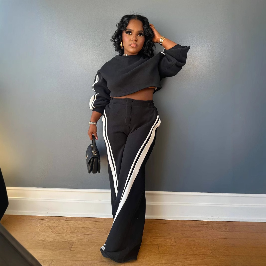 S391430 欧美时尚女装拼色拉链开衫阔腿抽绳运动长裤两件套套装女