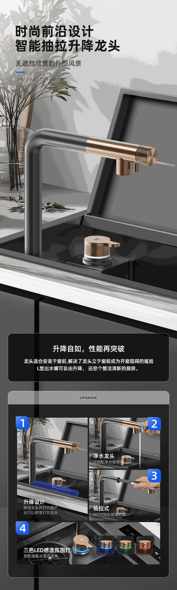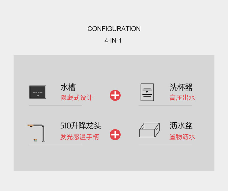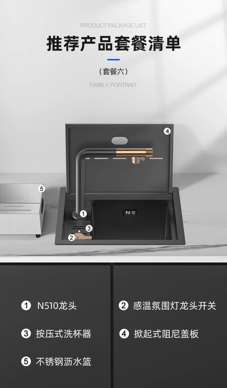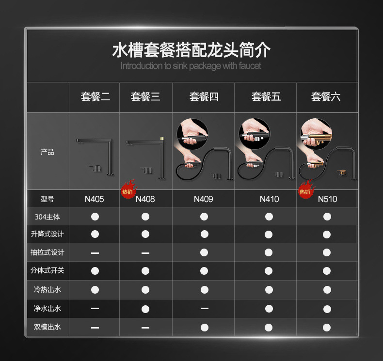 パッケージ 1: 蛇口なし,パッケージ 2: N405 蛇口,パッケージ 3: N408 温冷浄水三役蛇口,パッケージ 4: N409 引き出し式蛇口,パッケージ 5: N410 三目的引き出し式蛇口,パッケージ 6: N510 ゴールデン ライト 3 目的引き出し式蛇口
