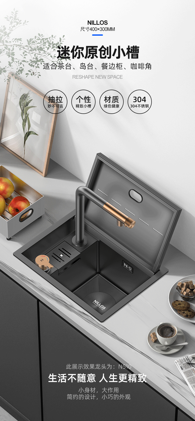 吧台水槽隐形纳米304不锈钢小单槽阳台高压洗杯器厨房岛台洗菜盆