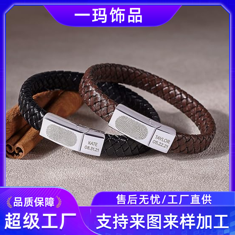 跨境时尚简约手链男士潮 DIY复古手工编织皮革手环刻字不锈钢手镯