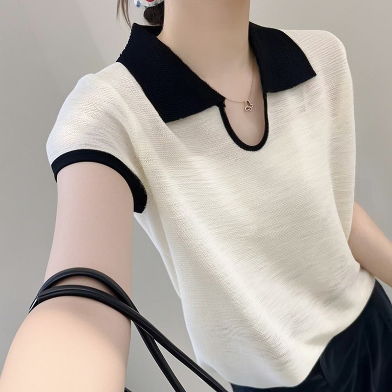 夏の新しいファッションラペルカラーカラーブロックカジュアル半袖セーターレディーススリムでハイエンドの気質トップトレンディ