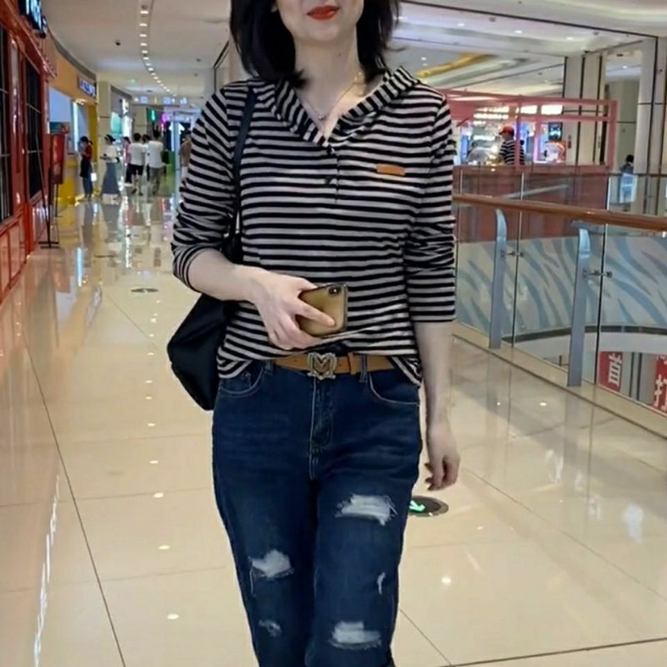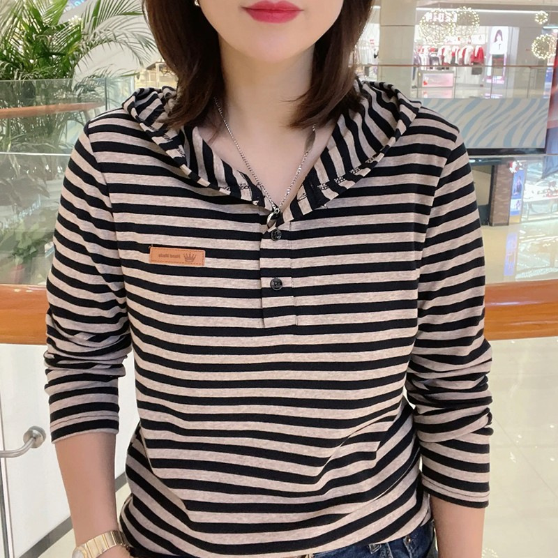 2025 綿春通勤長袖女性のフード付き Tシャツショートカジュアル多用途スリムストライプ底トップジャケット