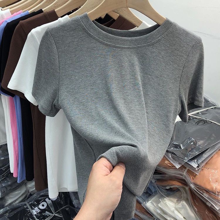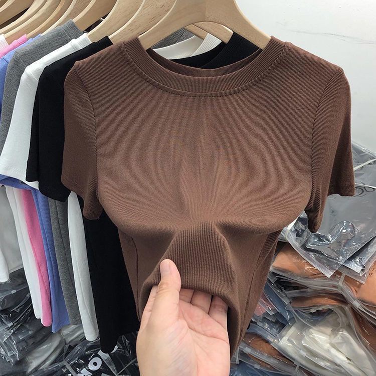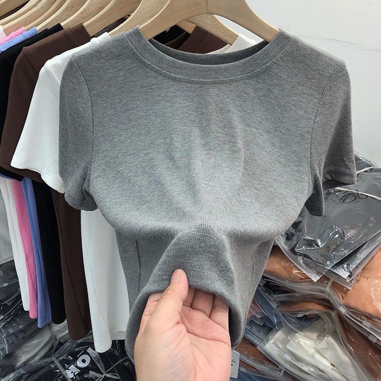 2025 夏の新スタイルスレッドラウンドネックスリム Tシャツ女性の半袖多用途インナー無地底シャツトップ Tシャツ