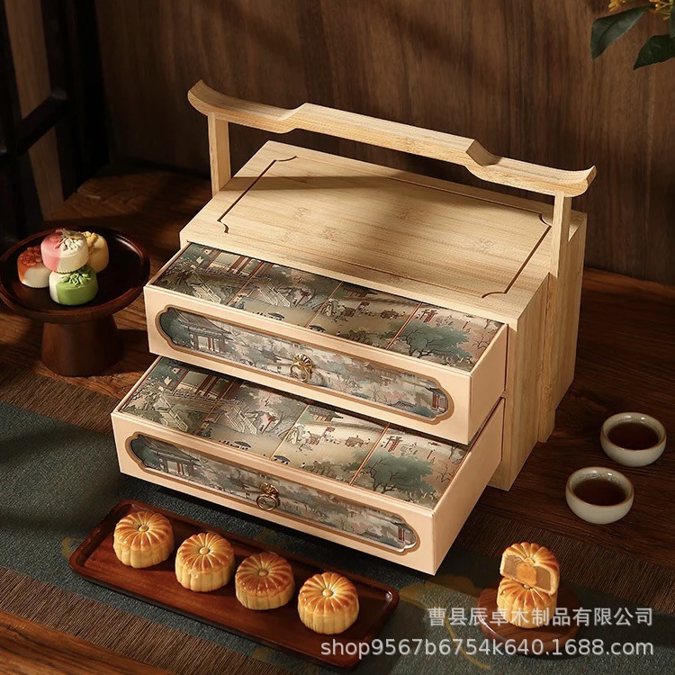 レトロな中秋節ギフトボックスポータブル二層スナックペストリー包装箱お土産バスケット食品ボックス月餅木箱