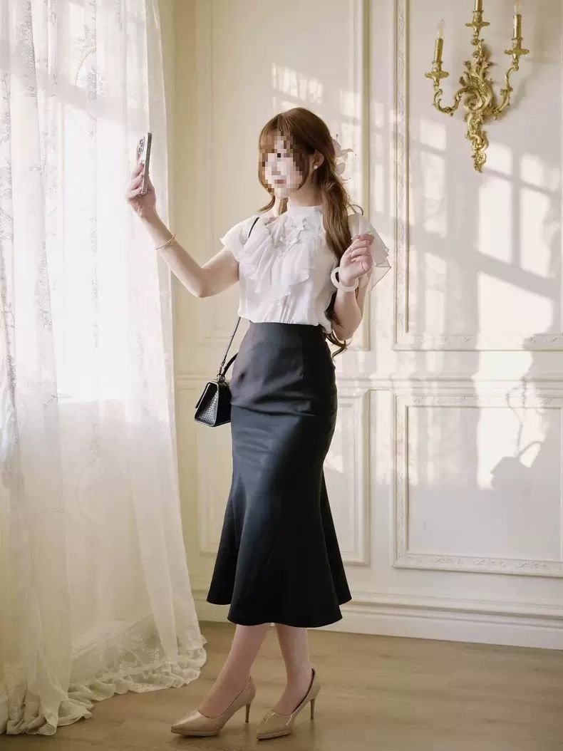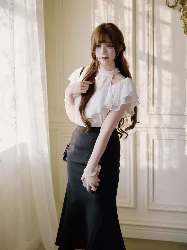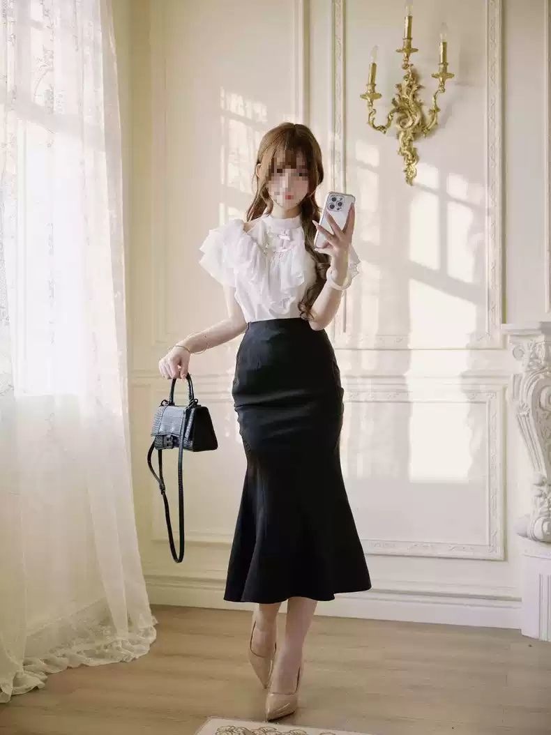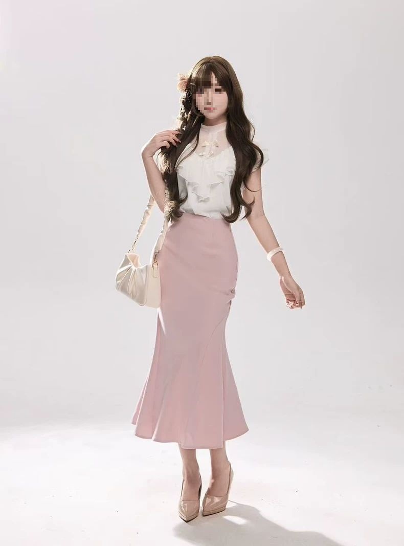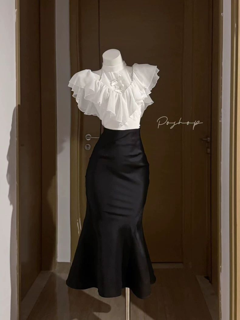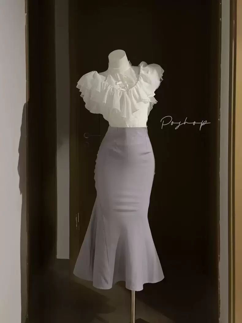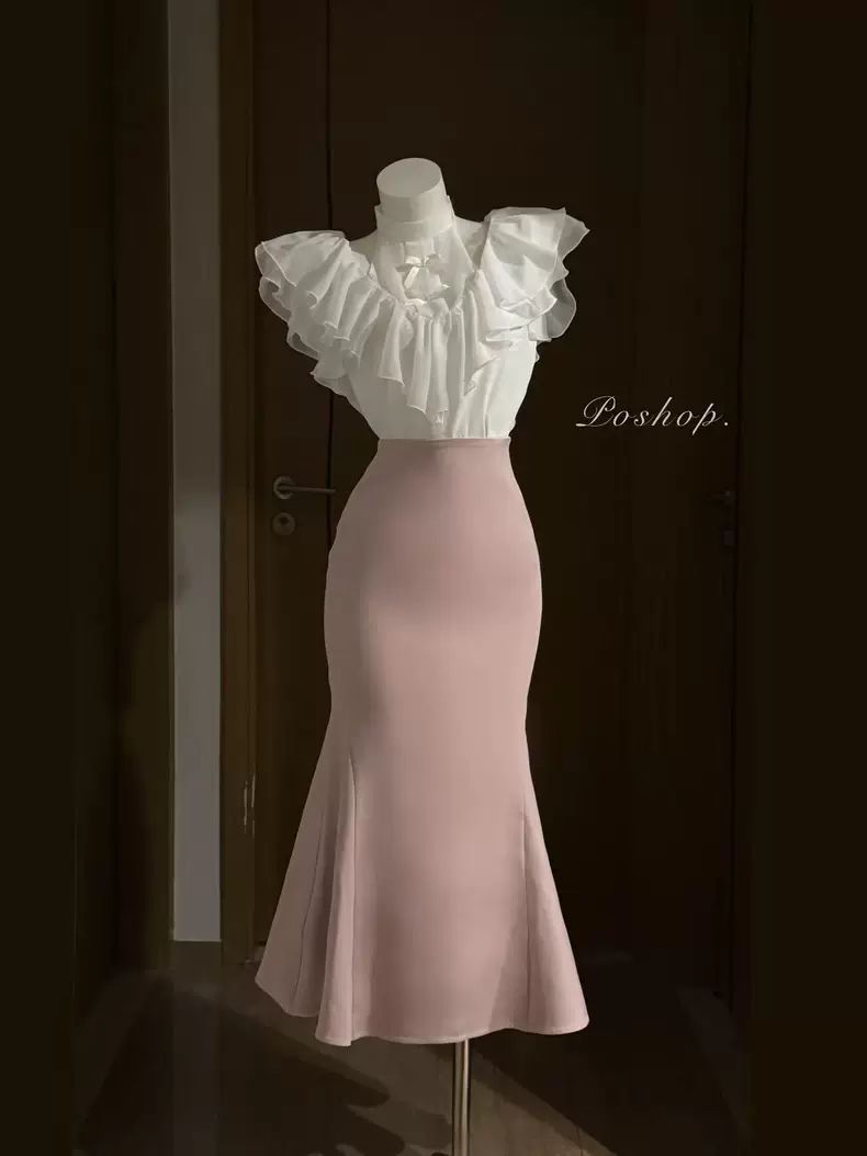 ホワイトフリルVネックトップ+ピンクフィッシュテールスカート,白フリルVネックトップス+黒フィッシュテールスカート,ホワイトフリルVネックトップ+パープルフィッシュテールスカート,白い長袖フリルVネックトップ+ピンクのフィッシュテールスカート,白い長袖フリルVネックトップ+黒のフィッシュテールスカート,白い長袖フリルVネックトップ+紫のフィッシュテールスカート,ホワイトフリルVネックトップ,ホワイト長袖フリルVネックトップ,ピンクのフィッシュテールスカート,黒のフィッシュテールスカート,パープルフィッシュテールスカート