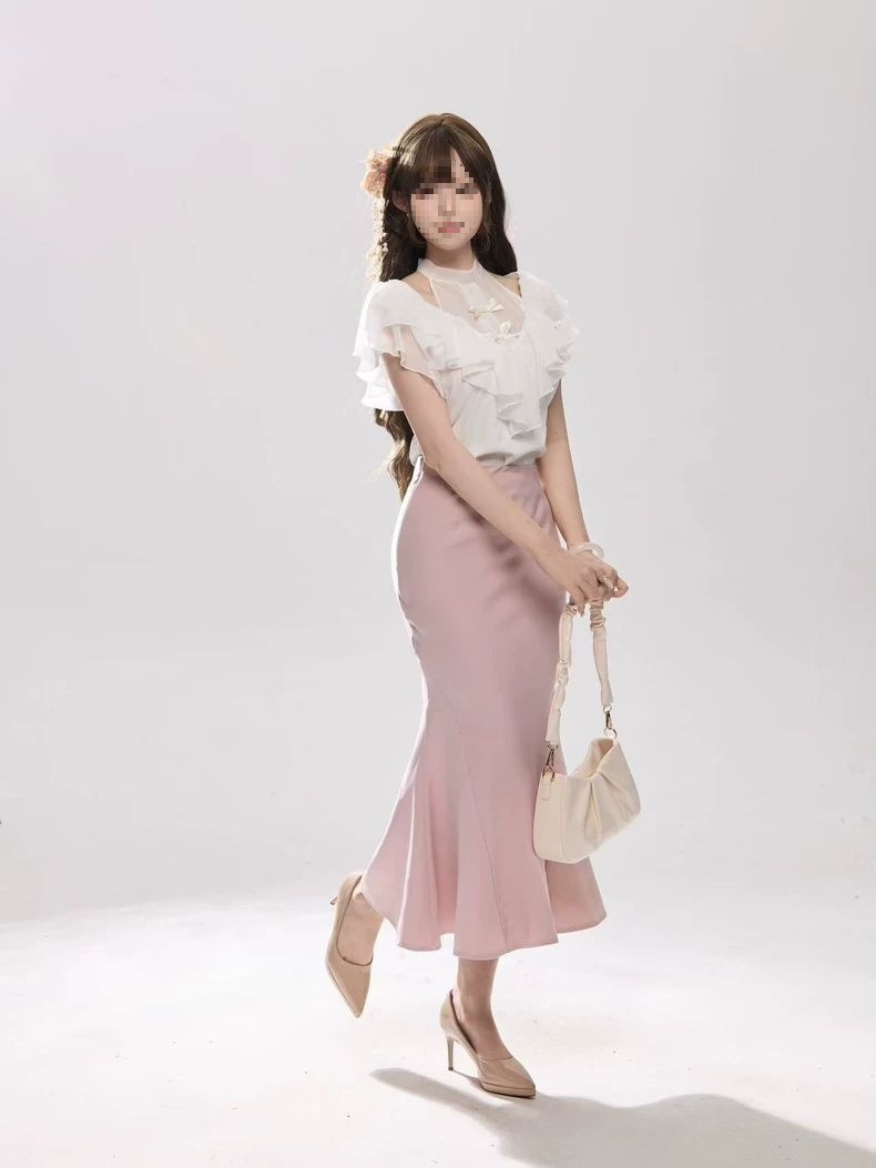 クリアフィッシュテールスカートスーツ Xiaoxiangfeng フライング スリーブ トップス 甘くて多用途なデート衣装無地