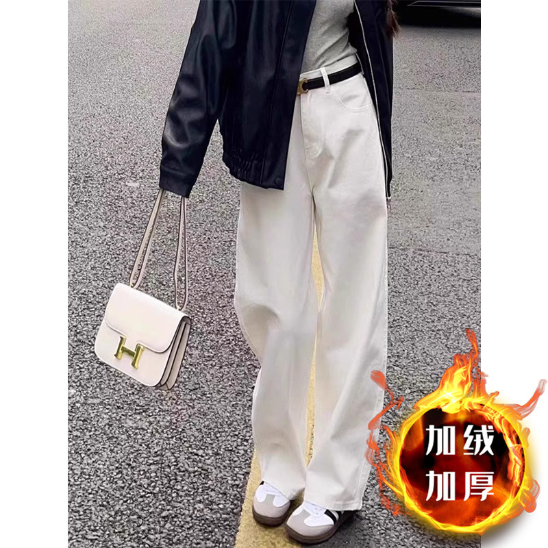 加绒加厚直筒牛仔裤女冬季新款大码胖mm高腰宽松阔腿显瘦窄版裤子