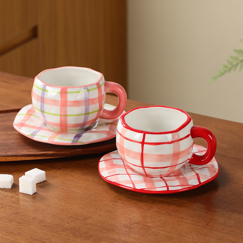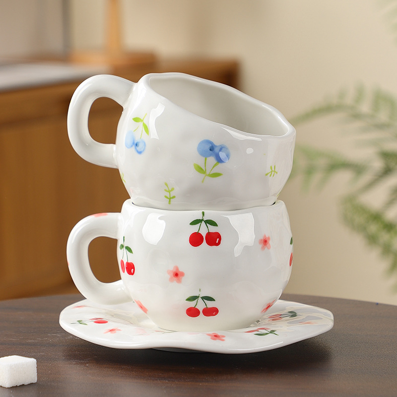 韓国式ins風創意不規則輸出手描きさくらんぼ釉薬下彩陶磁器コーヒーカップセット高顔値