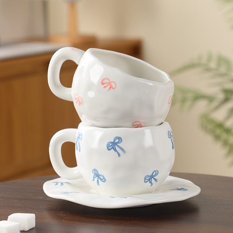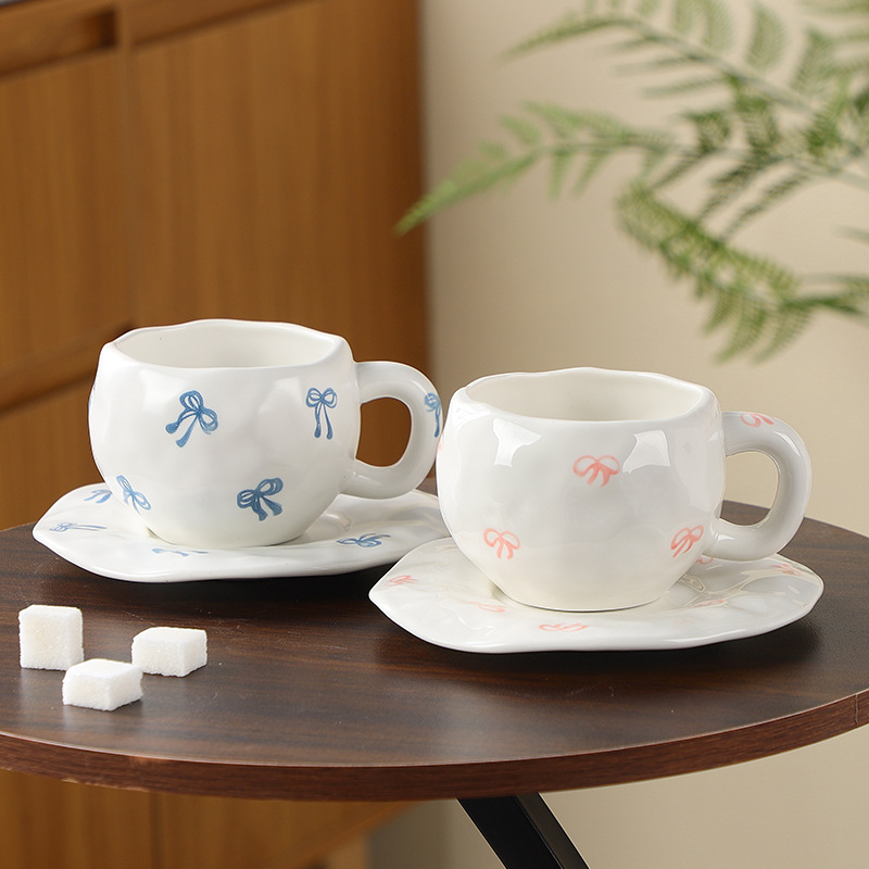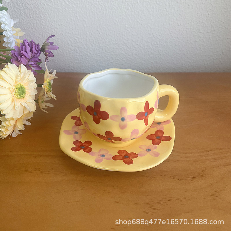 跨境韩式ins风 手绘花朵陶瓷杯碟手捏不规则创意咖啡杯碟下午茶杯