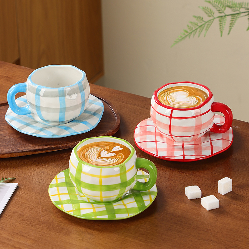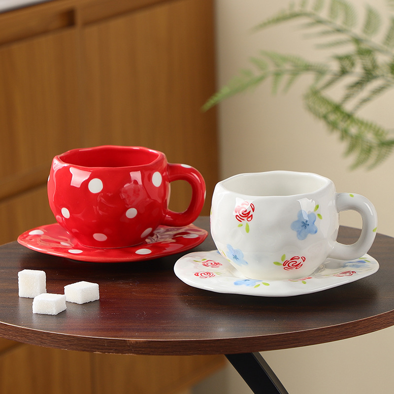 Ins風オッポン越境手つまみ愛手描きレトロ花卉不規則コーヒーカップ皿昼寝陶磁器カップ皿