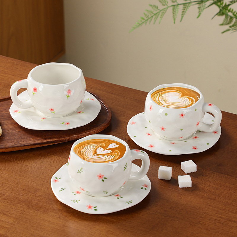 Ins风少女心小さな花セラミックコーヒーカップ皿手握り手描き不规则なカップ皿アフタヌーンティーラテカップ