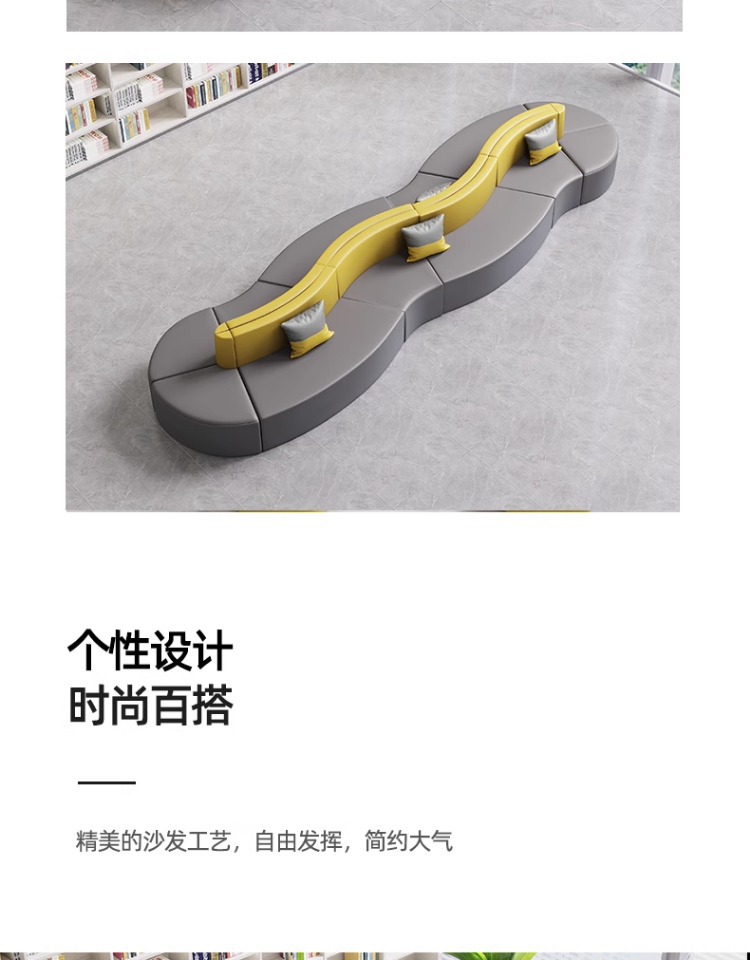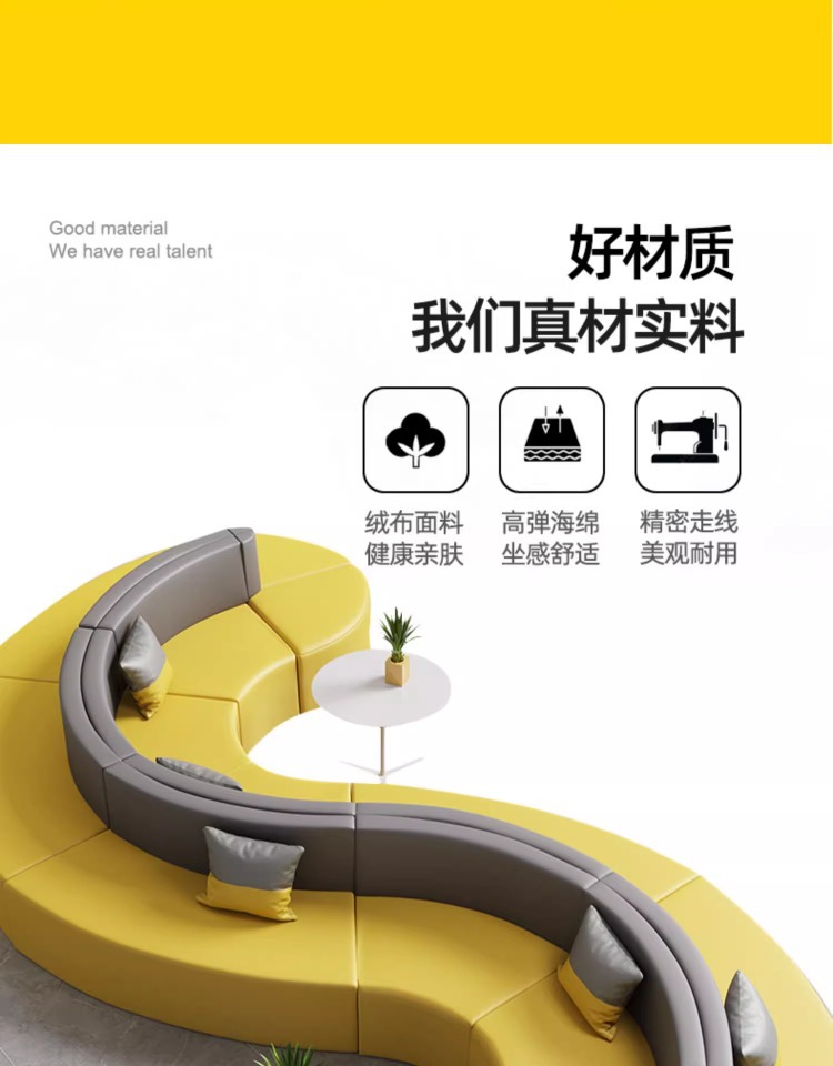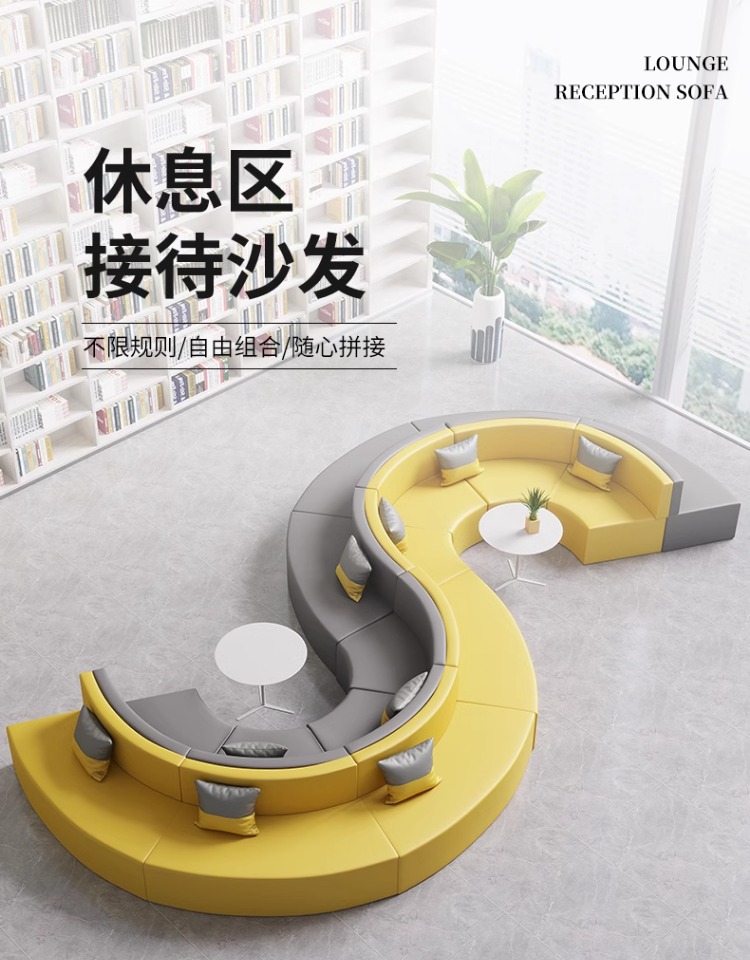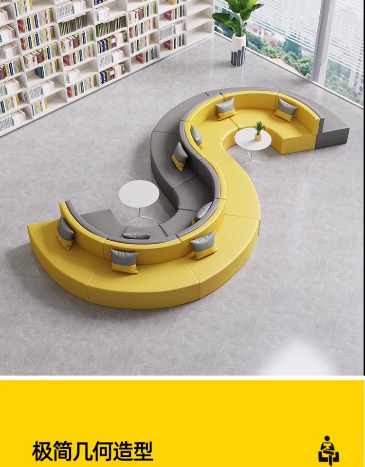 カウンターシート、商談、営業所、応接室、休憩所、特殊形状スプライシングロングベンチ、特殊形状ソファとコーヒーテーブルの組み合わせ