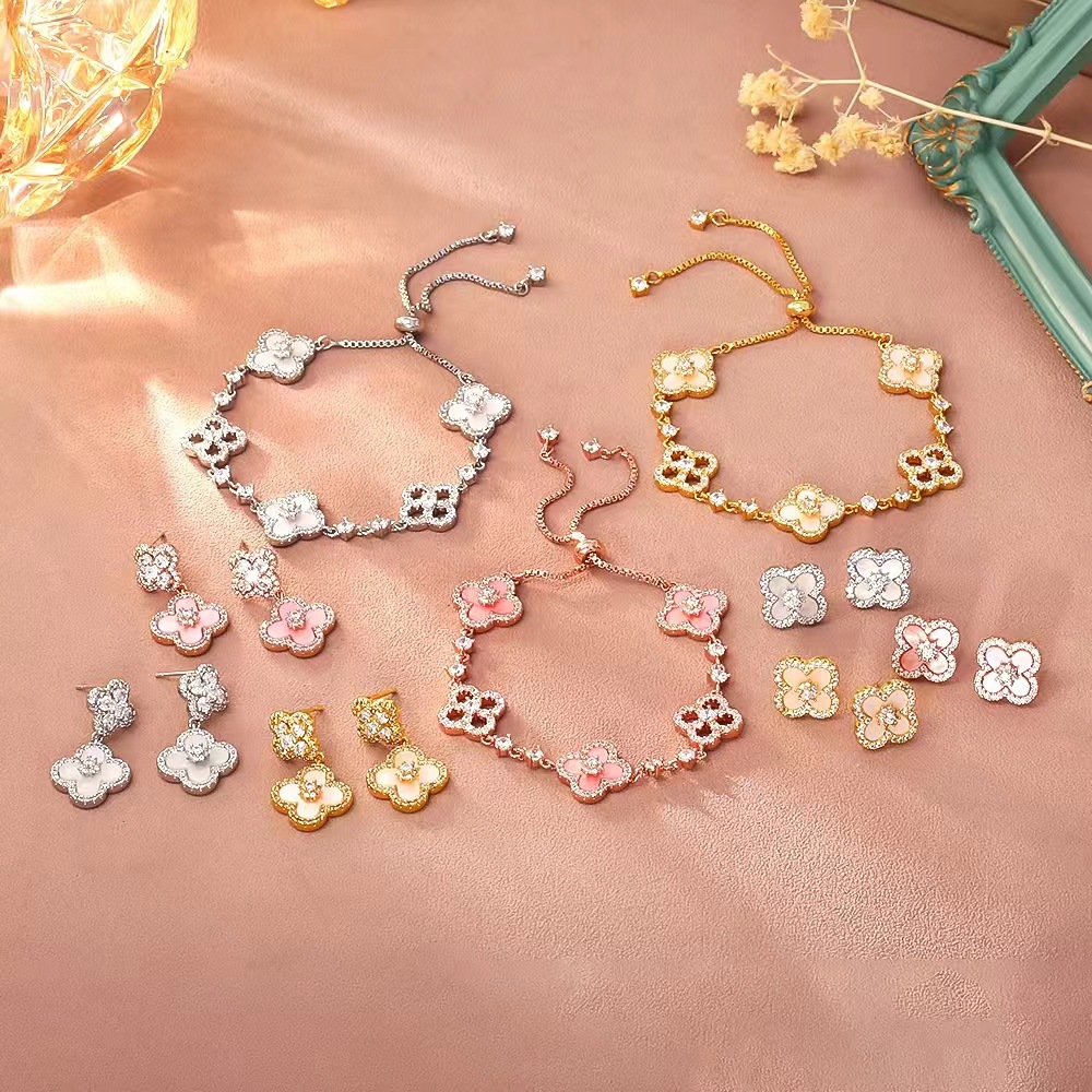 国境を越えた人気のネットセレブピンクラッキー四つ葉フラワーブレスレットセットニッチハイエンド外国貿易ネックレスブレスレットセット