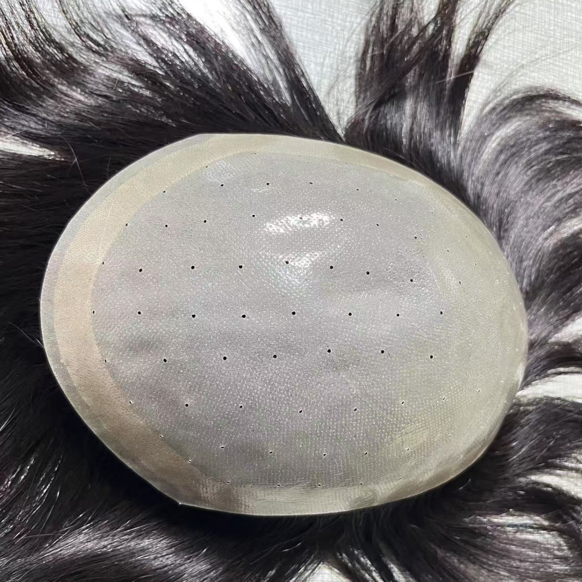 ドイツ製糸使用、完全ニードルレスメンズヘアピース、人毛使用、頭皮を模倣した人工毛皮、隠しヘアピース、自然な色