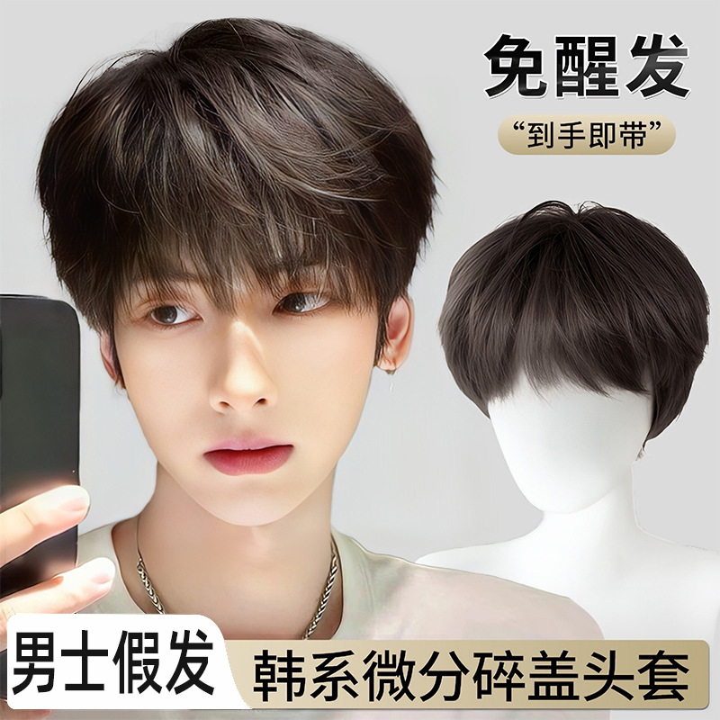 男性用ウィッグ、フルヘッドカバー、韓国風、男の子用微細カットショートヘア、男性用ナチュラルふわふわ男性用シミュレーションウィッグセット