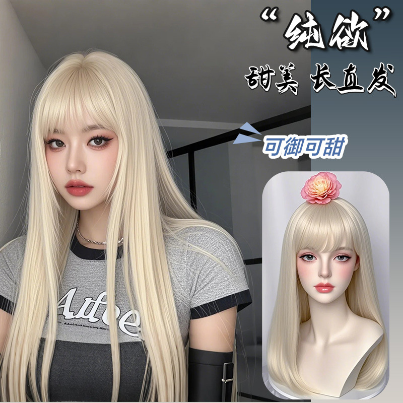 ロングヘアーの女性用ウィッグ、フルカチューシャ、和風ナチュラルネットセレブモデル、ガールズグループエア前髪、JKロングストレートヘア、リアルな顔整形