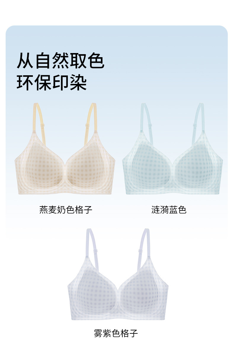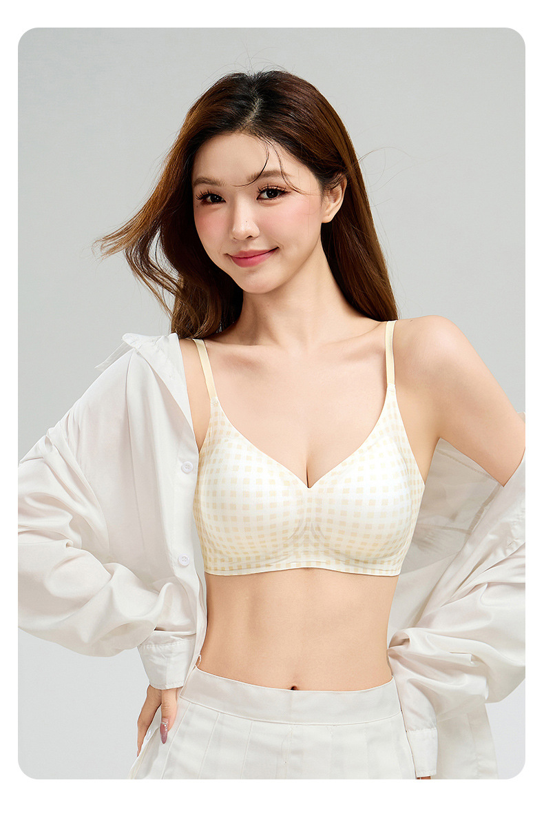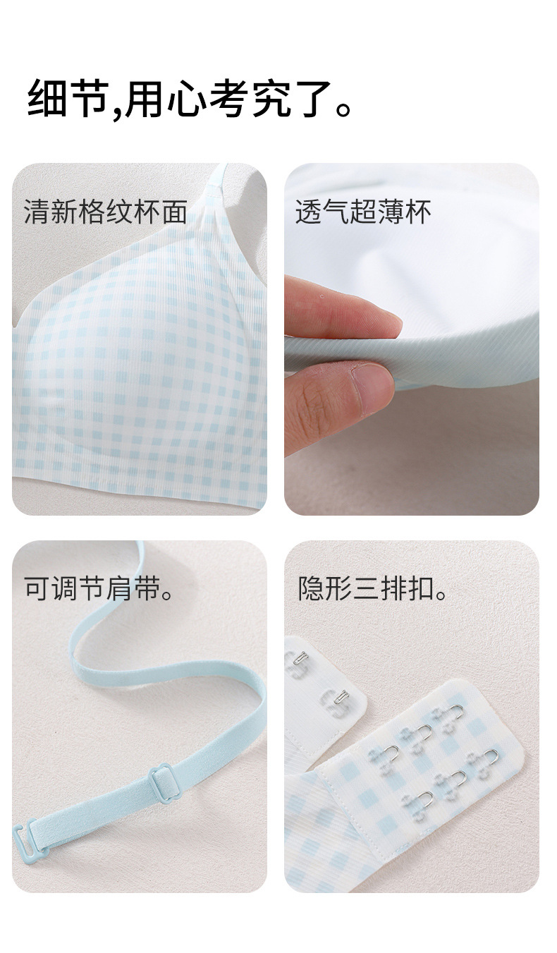 アイスシルクチェック柄シームレス下着女性の夏超薄型通気性胸固定カッププッシュアップソフトサポートブラジャー