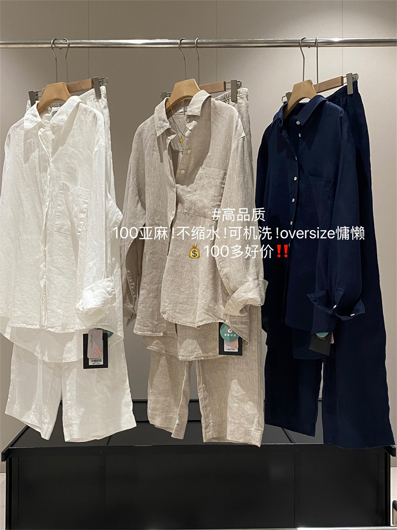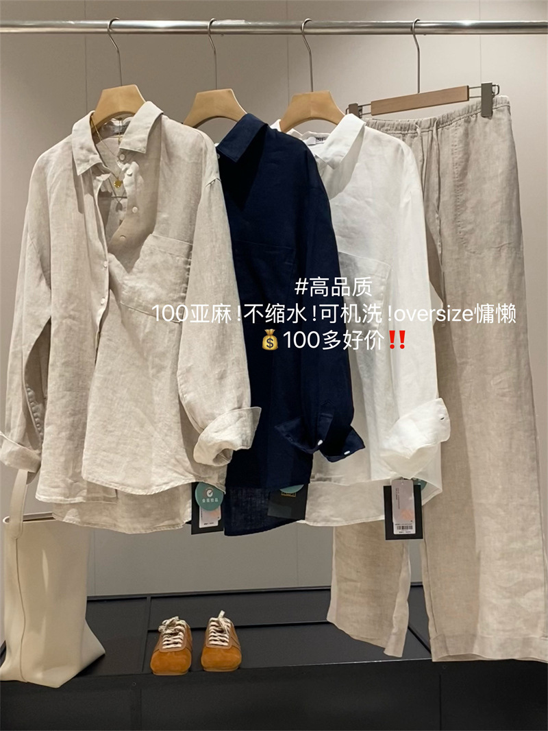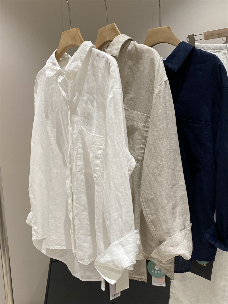 100リネン! 縁芝居をする雰囲気がシンプルで、襟をめくって長袖のゆったりしたシャツの女性を掛けます。