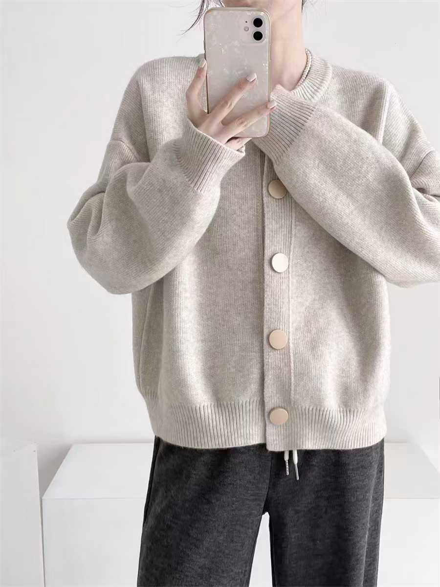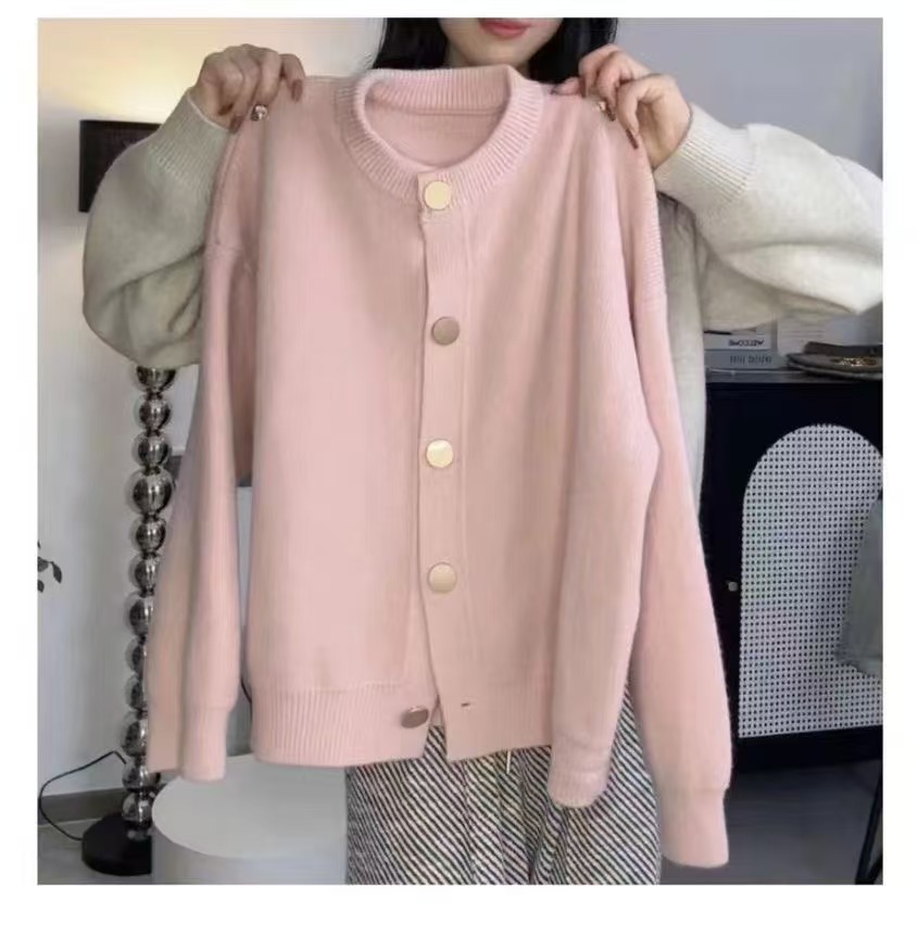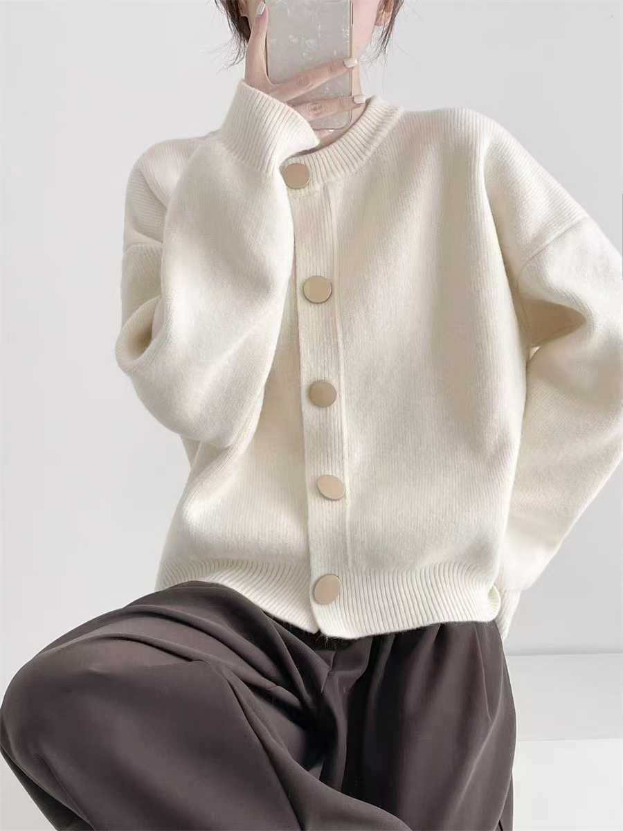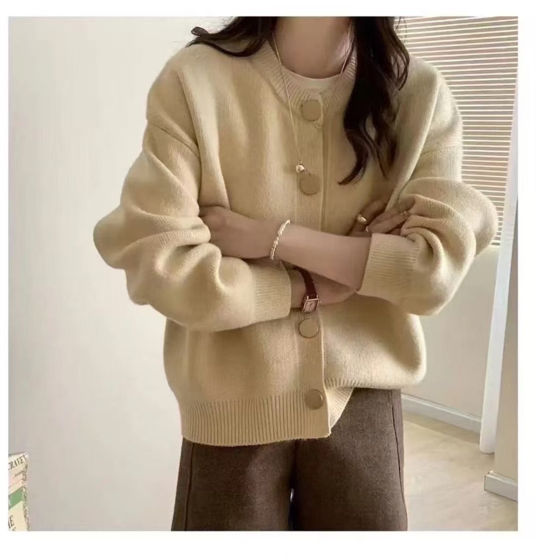 2024秋冬韩版单排扣纯色针织毛衣外套开衫慵懒宽松圆领秋冬上衣女
