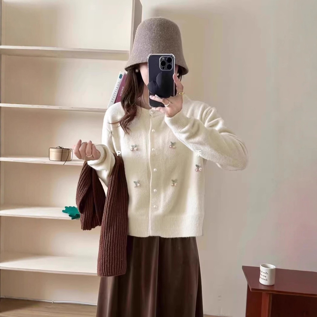 早秋甜美刺绣樱桃珠珍毛衣外套女秋冬新款设计感小众百搭针织上衣