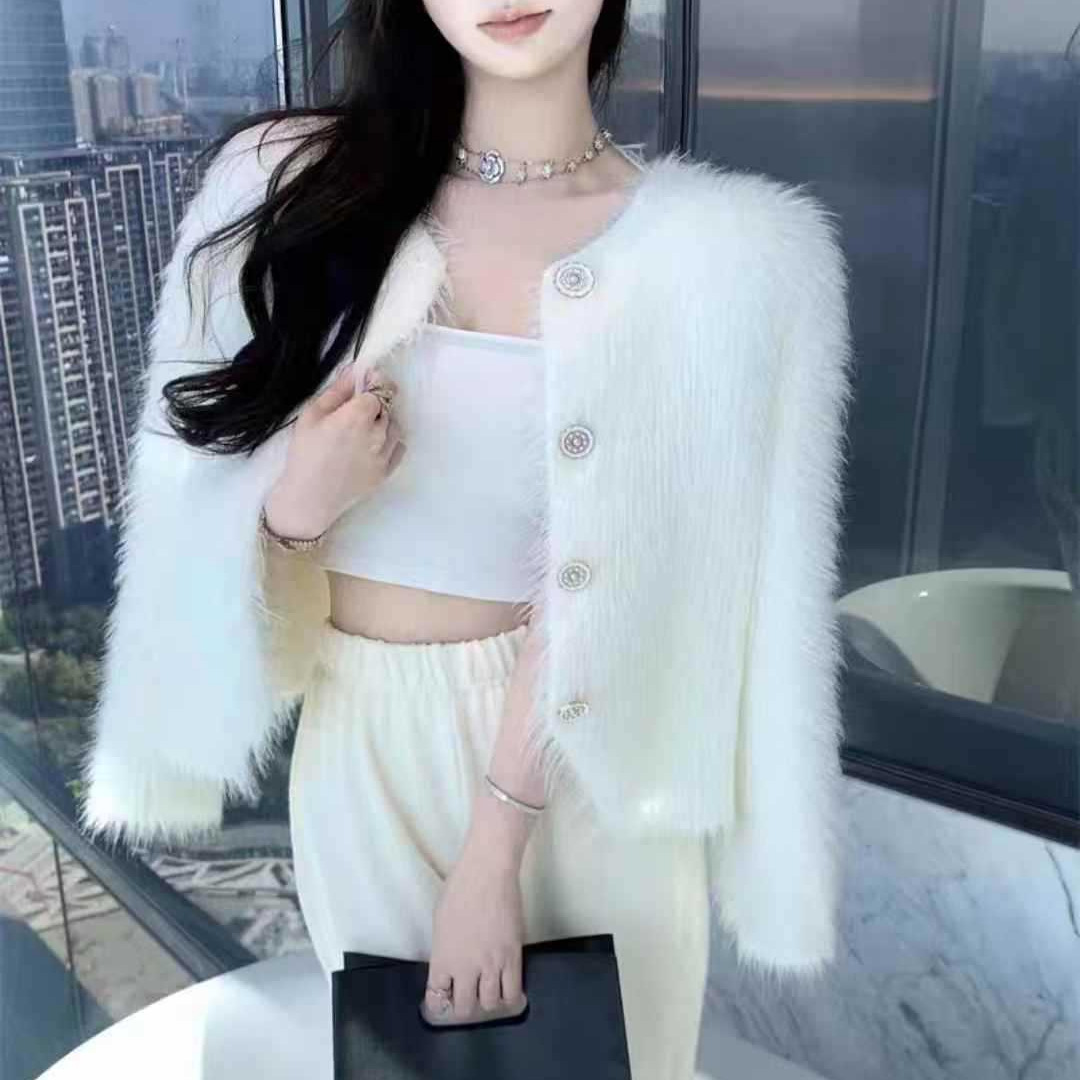 仿水貂绒针织开衫毛衣外套女秋冬加厚小香风短款百搭欧货软糯女装
