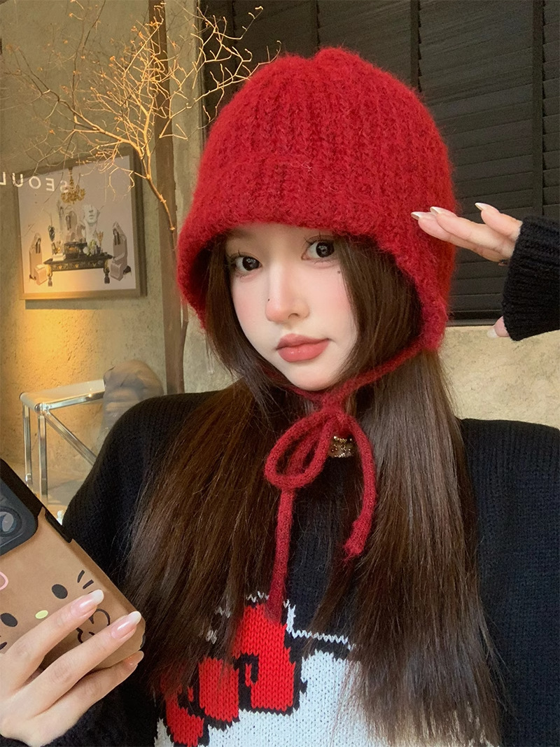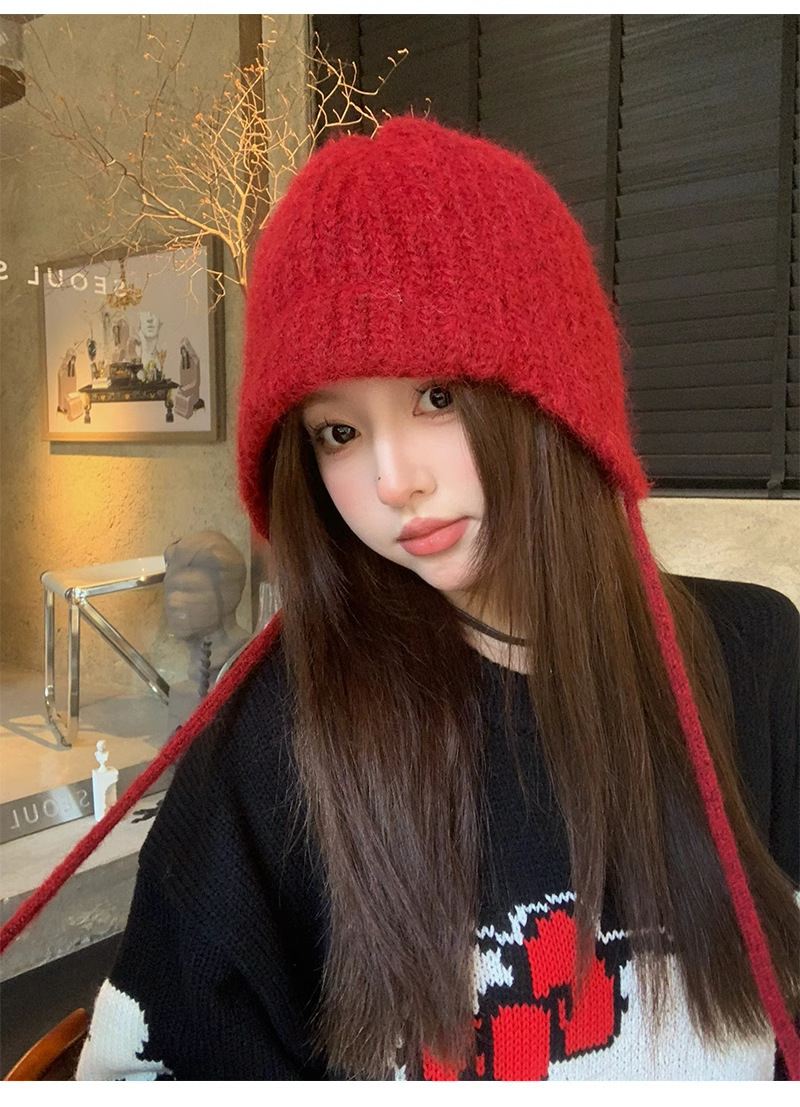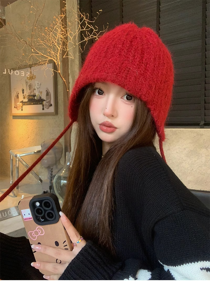 雷锋帽日系纯色毛绒绑带毛线帽女秋冬季保暖护耳护耳软糯针织帽
