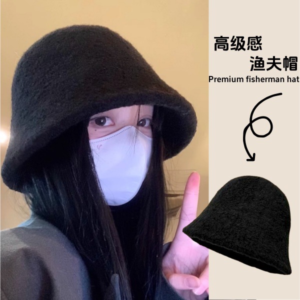 羊羔毛水桶帽女新款日系显脸小渔夫帽纯色时尚韩系百搭盆帽高级感