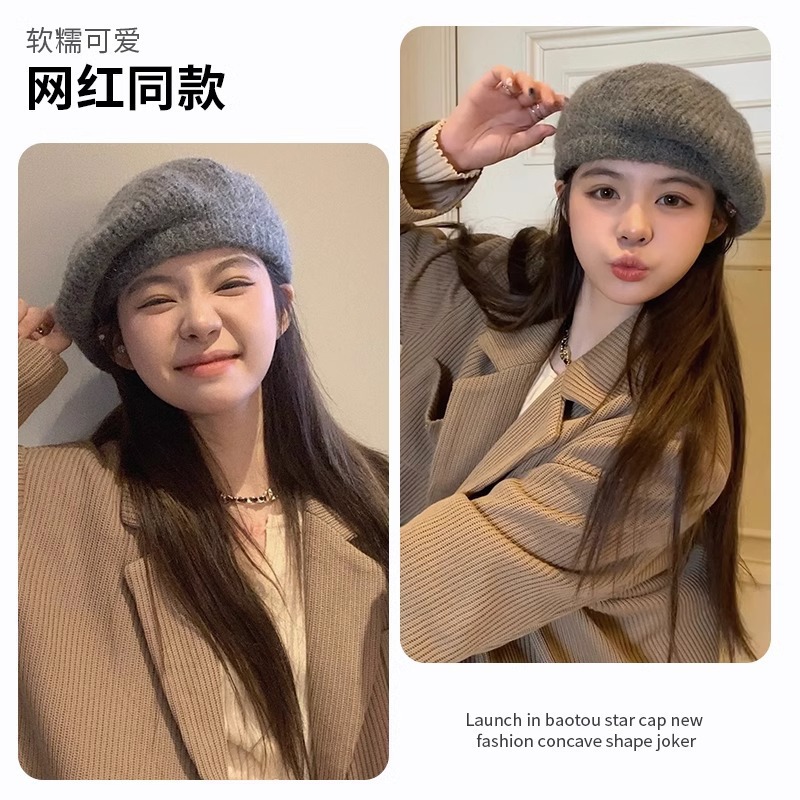 女性用の秋冬ニットベレー帽、ファッショナブルで多用途な豪華なペインターハット、新しい大きな頭囲、顔が見える小さな帽子、冬