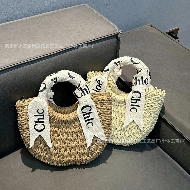 スポット卸売レトロストローバッグラウンドバケットバッグ織バッグメッセンジャーバッグ織りレターリボンビーチバッグレディースバッグ