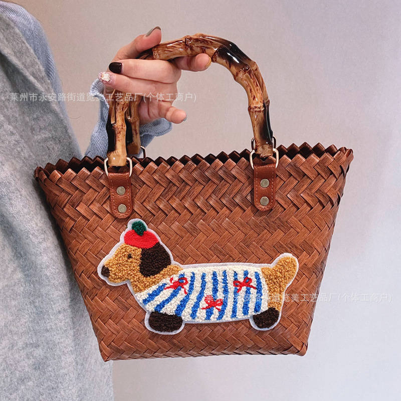 ブラウンダックスフントストライプストローバッグレトロ織バッグ野菜バスケット籐ハンドバッグ通勤トートバッグ