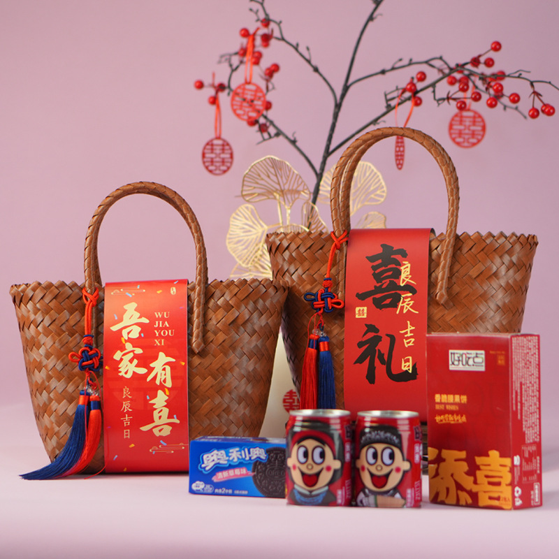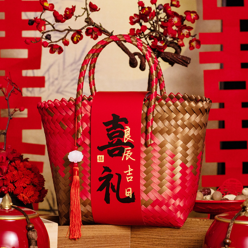 新中式伴娘伴手礼编织篮子结婚年会乔迁周岁寿喜铺礼品包装手提包