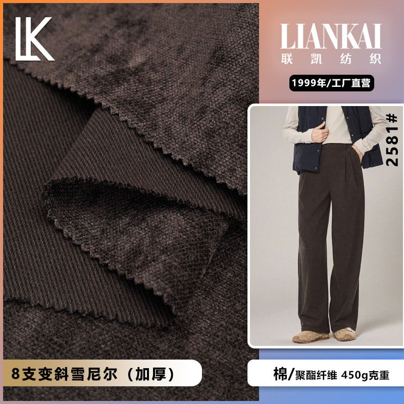 8支变斜雪尼尔加厚斜纹棉布 450g秋冬时尚裤装外套梭织棉纱卡面料