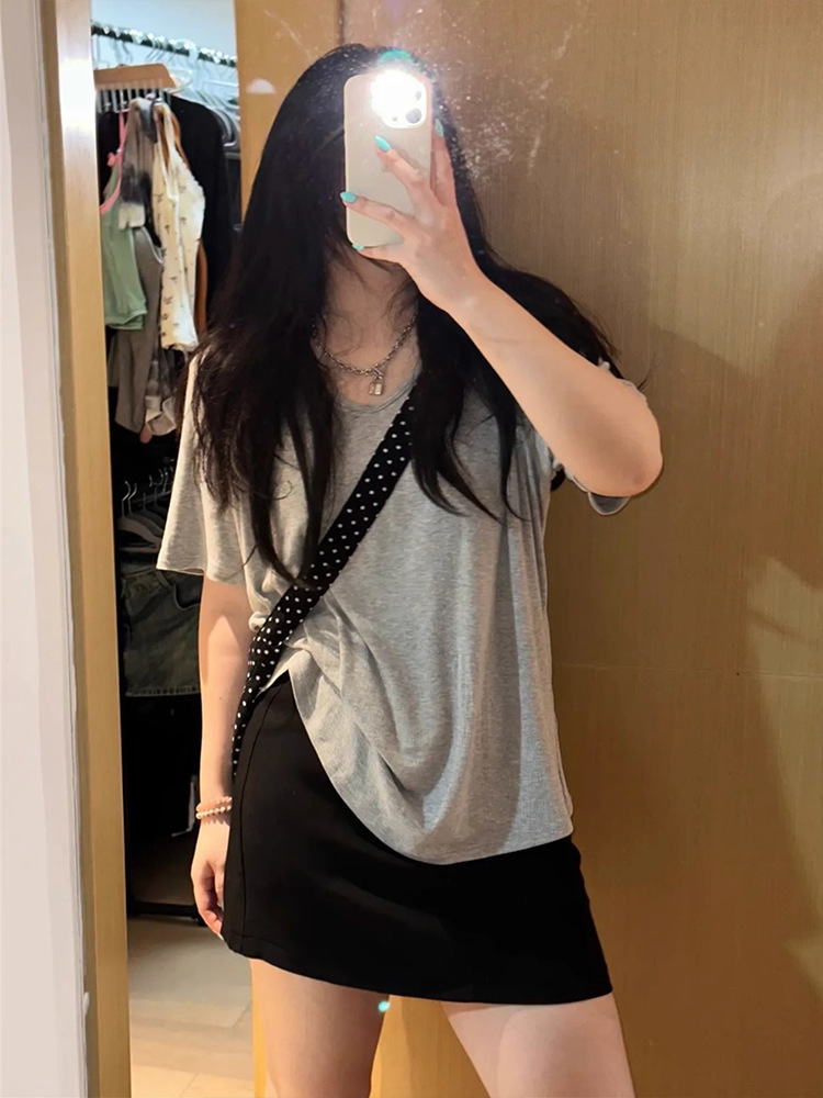 スリット入りVネック半袖Tシャツ レディース 夏 2025年新作 デザイン感のある鎖骨見せ ゆったりとした学生向けトップス 女性用