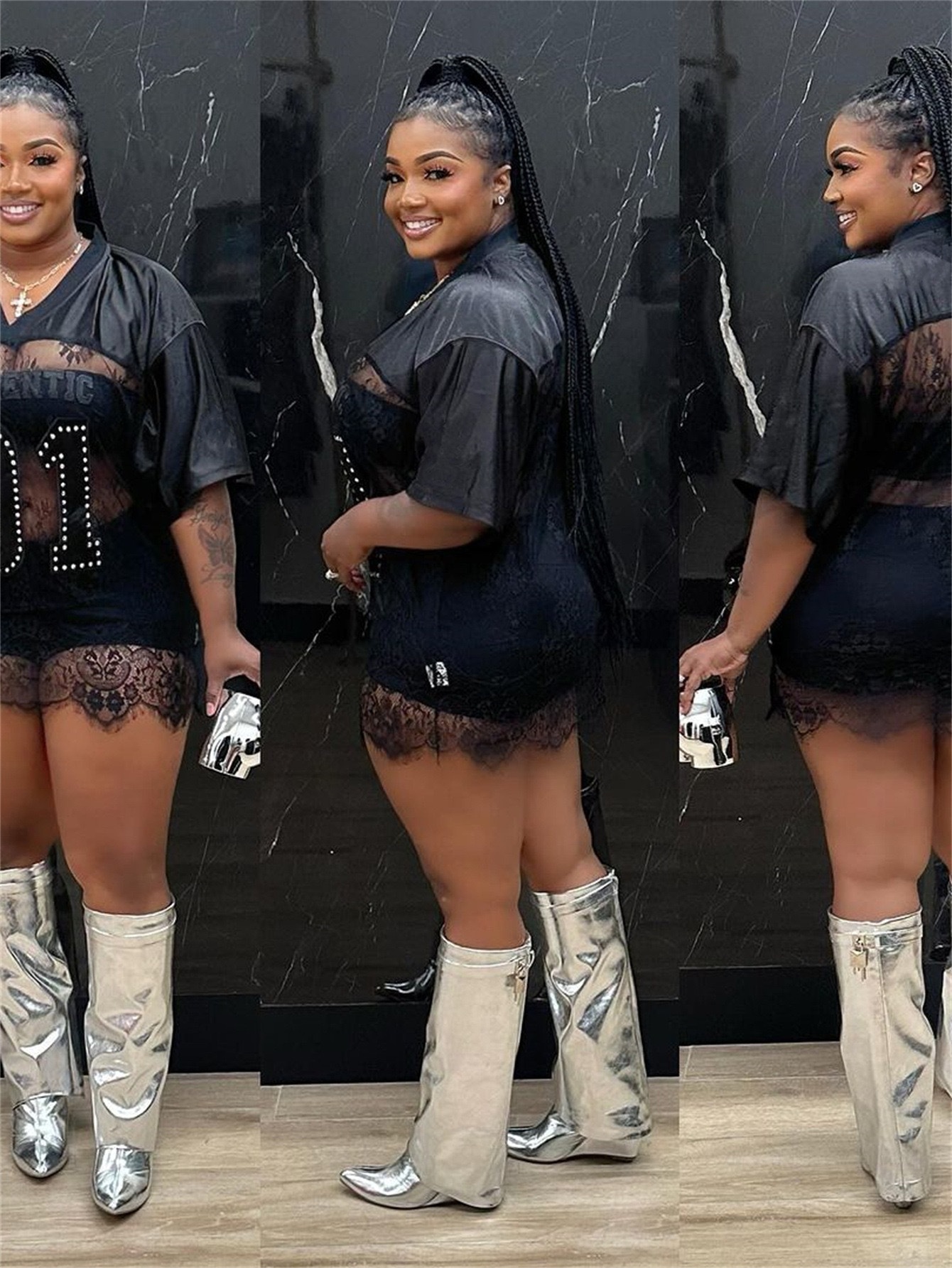 2025 新しいクロスボーダーヨーロッパとアメリカのプリントルーズカジュアルストリートシースルーセクシーなレーススプライシング Tシャツ半袖トップ