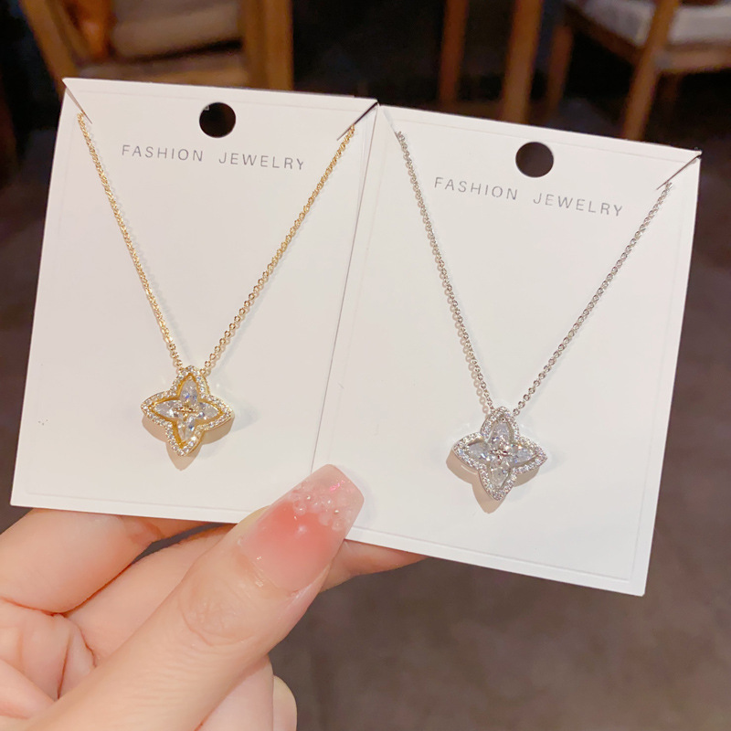 夏の新しいスタイル、ファッショナブルで軽い高級感、フルダイヤモンドの四つ葉の花のペンダントネックレス、ニッチで絶妙で多用途なデザインのネックレス