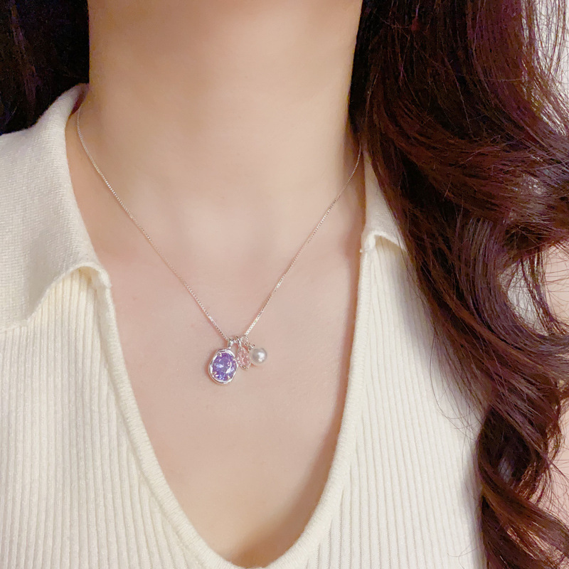 ヨーロッパとアメリカのニッチデザイン厚いシルバーパープルクリスタルパールマルチペンダントネックレスパーソナライズされたファッションライトラグジュアリー多用途鎖骨チェーン女性用