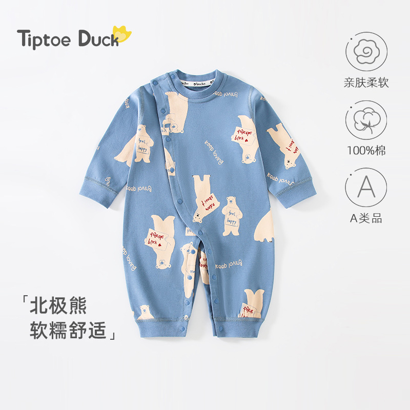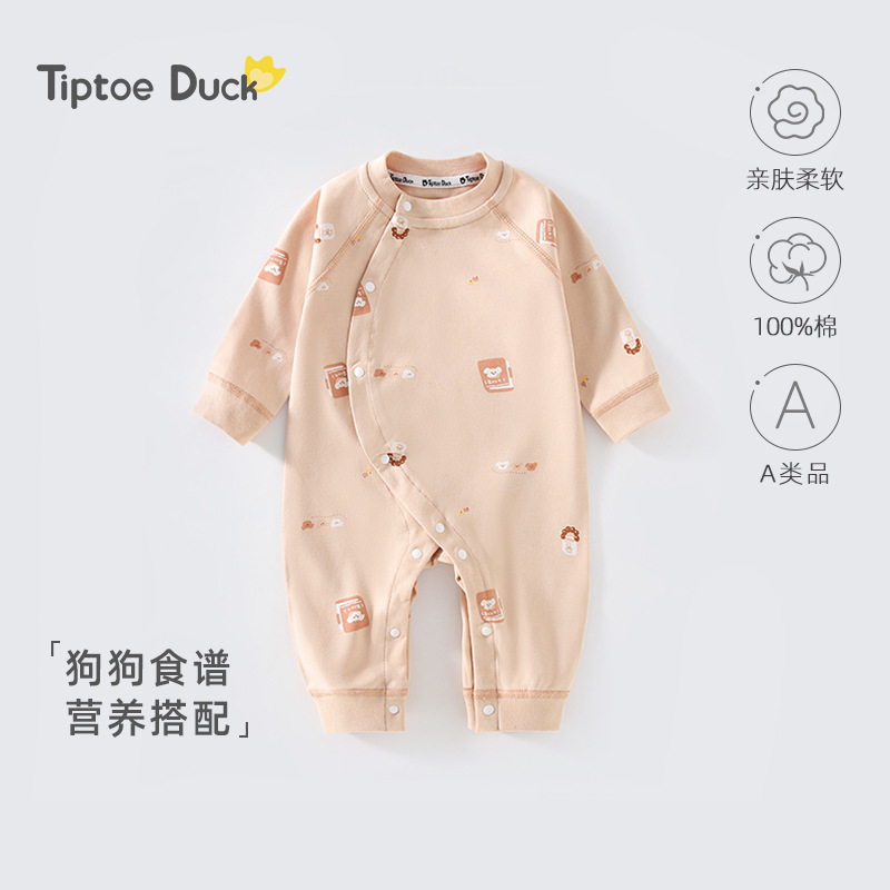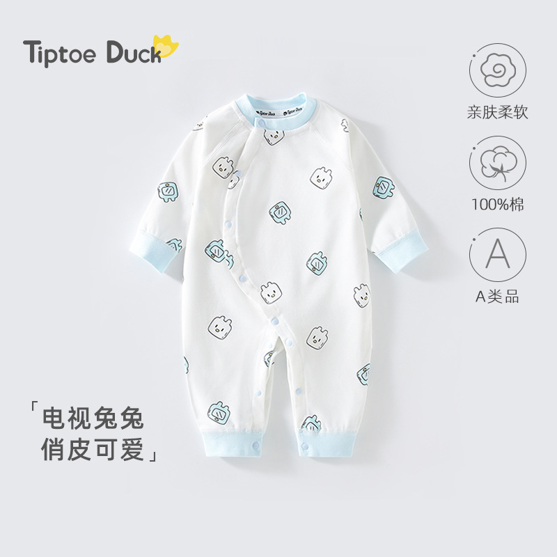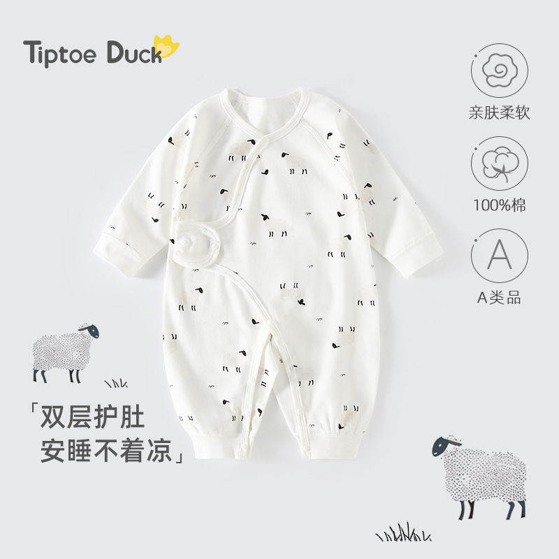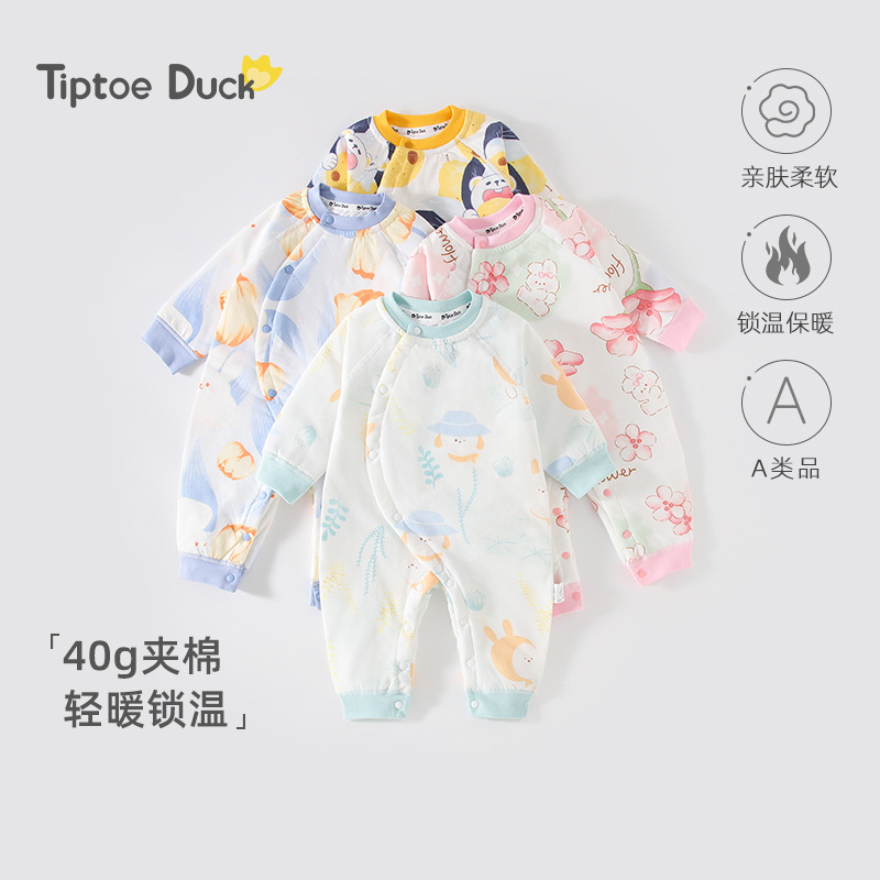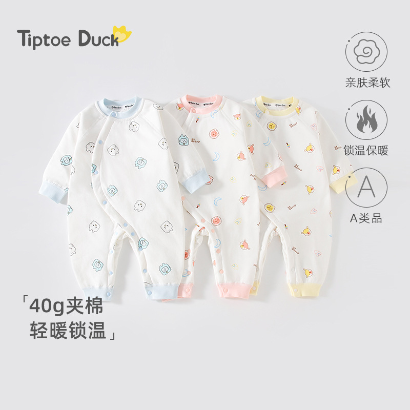 翘脚鸭婴儿宝宝春秋季纯棉A类新生儿锁温保暖夹棉斜开扣连体衣