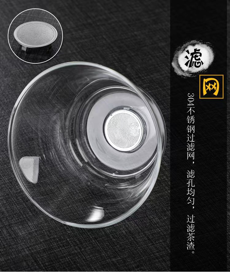 ティーストレーナー一体型フィルターハンドル付きフェアカップガラス、ティーカップ、茶道、ティーセット、ティーフィルター、ティーディスペンサー